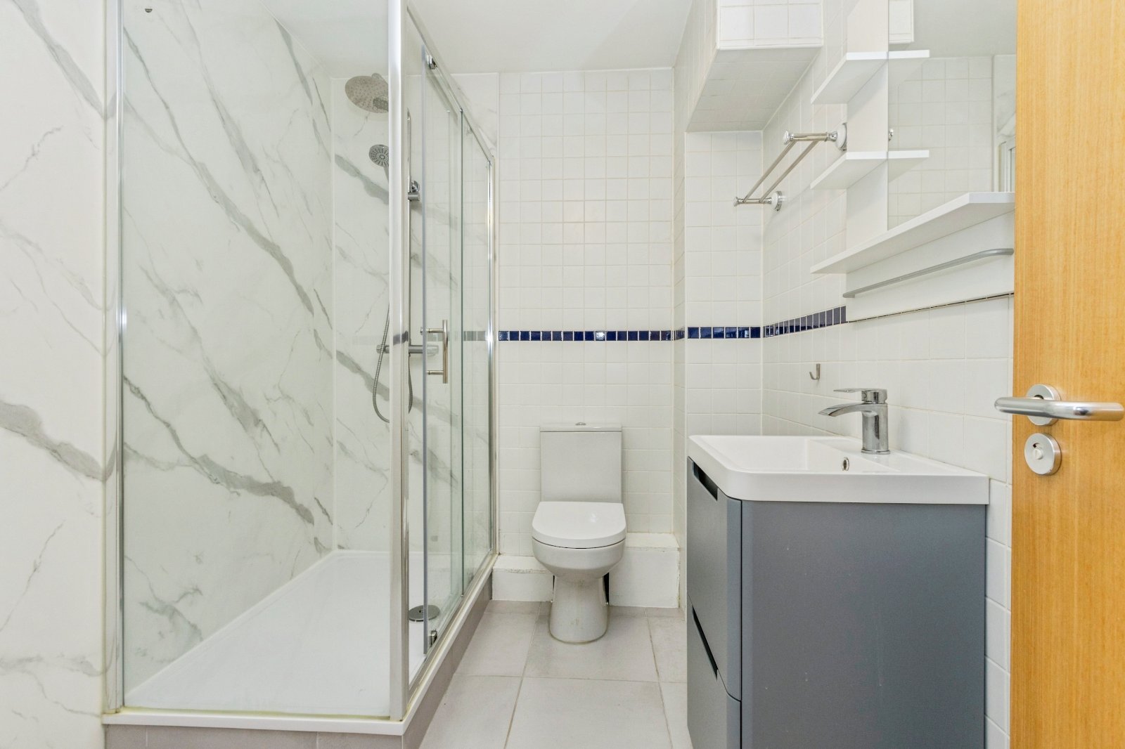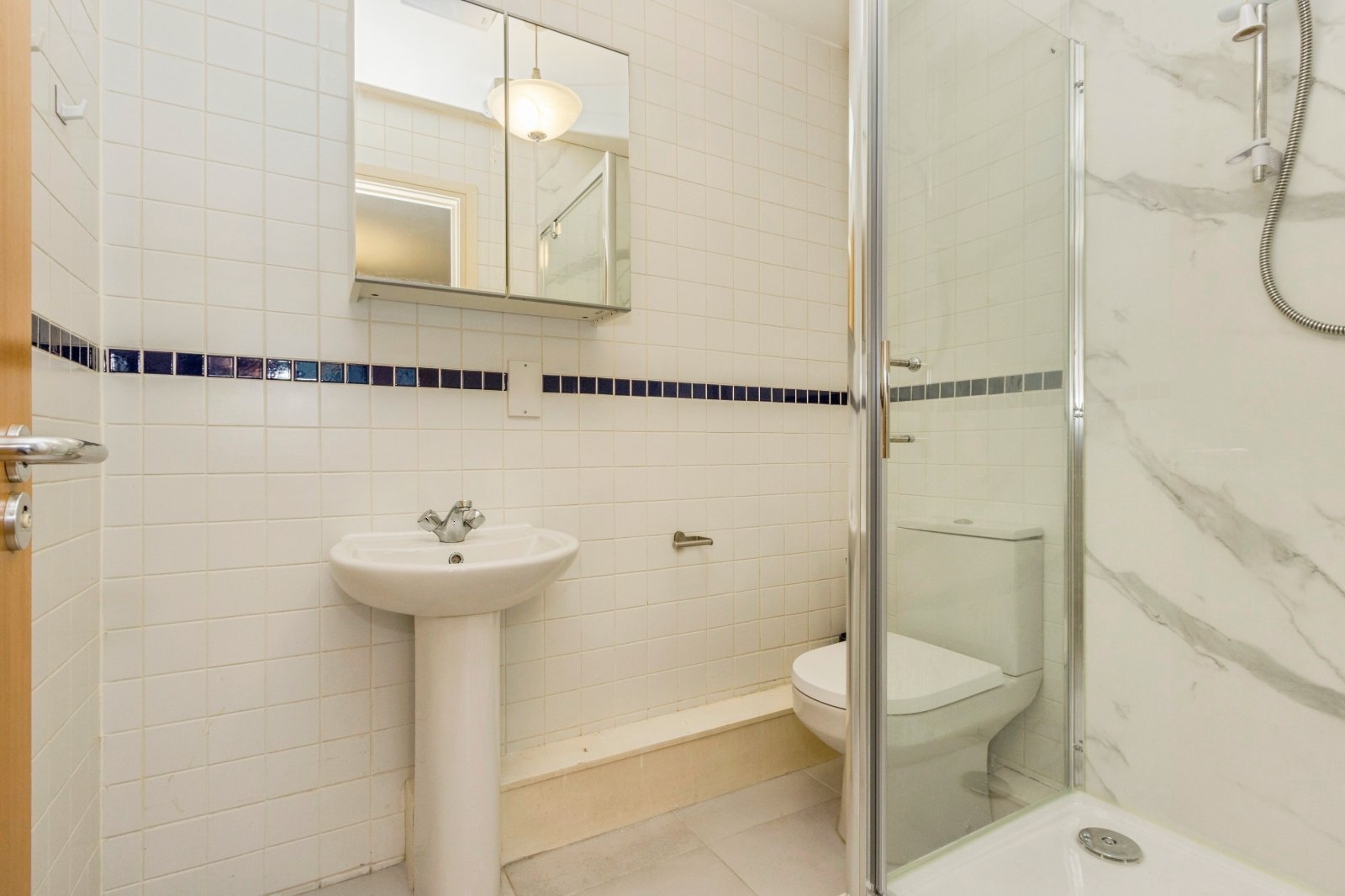 A stunning bathroom suite with a large shower enclosure with a thermo controlled shower unit, a low flush wc and a wash hand basin with mixer tap. The shower room has a tiled floor, part tiled walls and newly fitted PVC panelling.