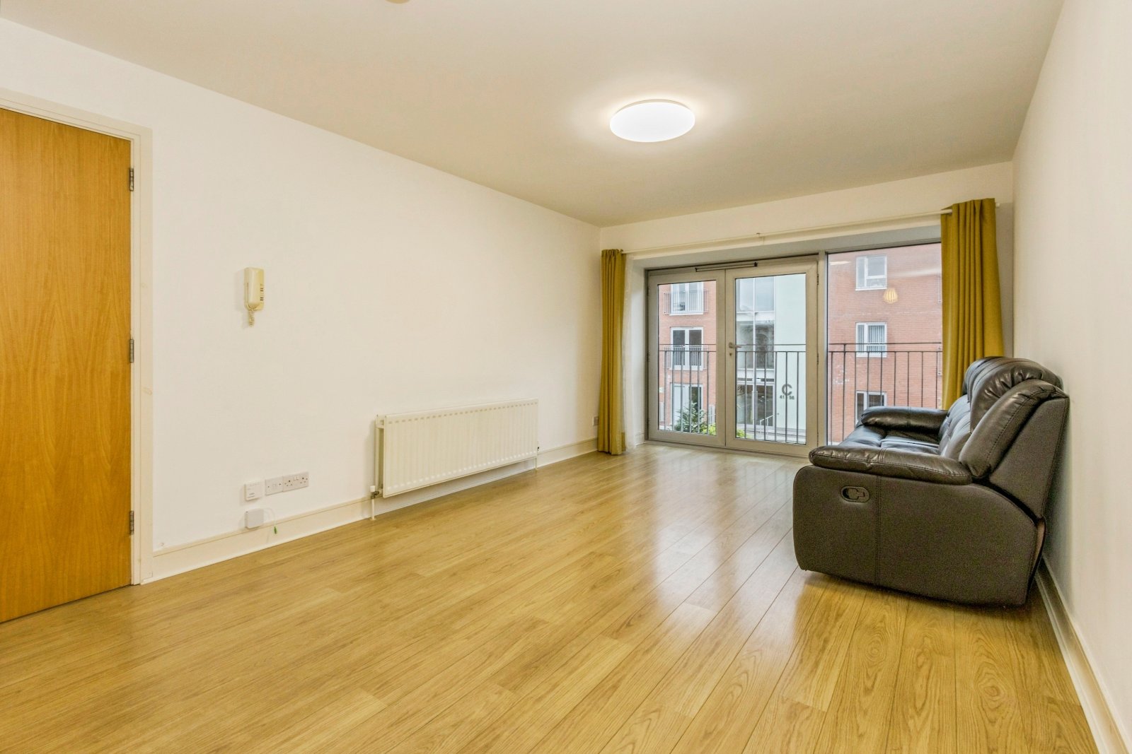 A bright and spacious living room, with laminate flooring and French doors to a Juliet balcony overlooking the communal courtyard. The kitchen has an excellent range of units, and integrated appliances to include a gas hob, electric oven, concealed extractor. There is also a dishwasher and washing machine, and a single drainer with mixer tap.