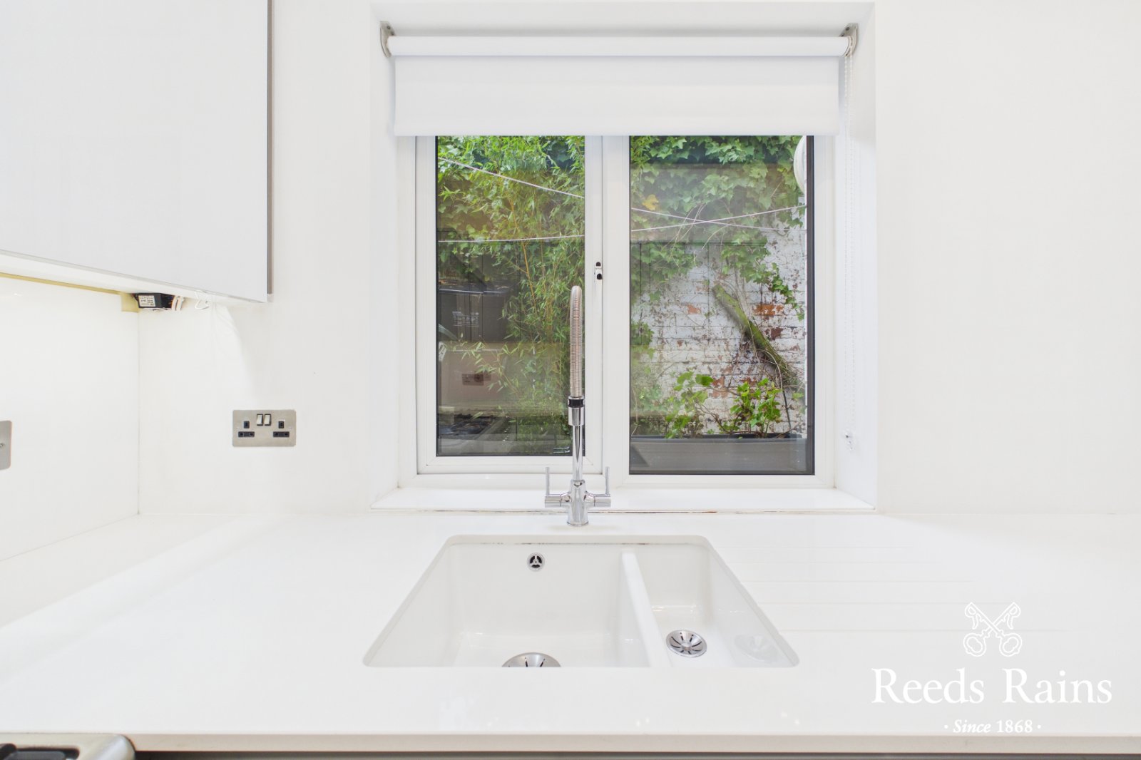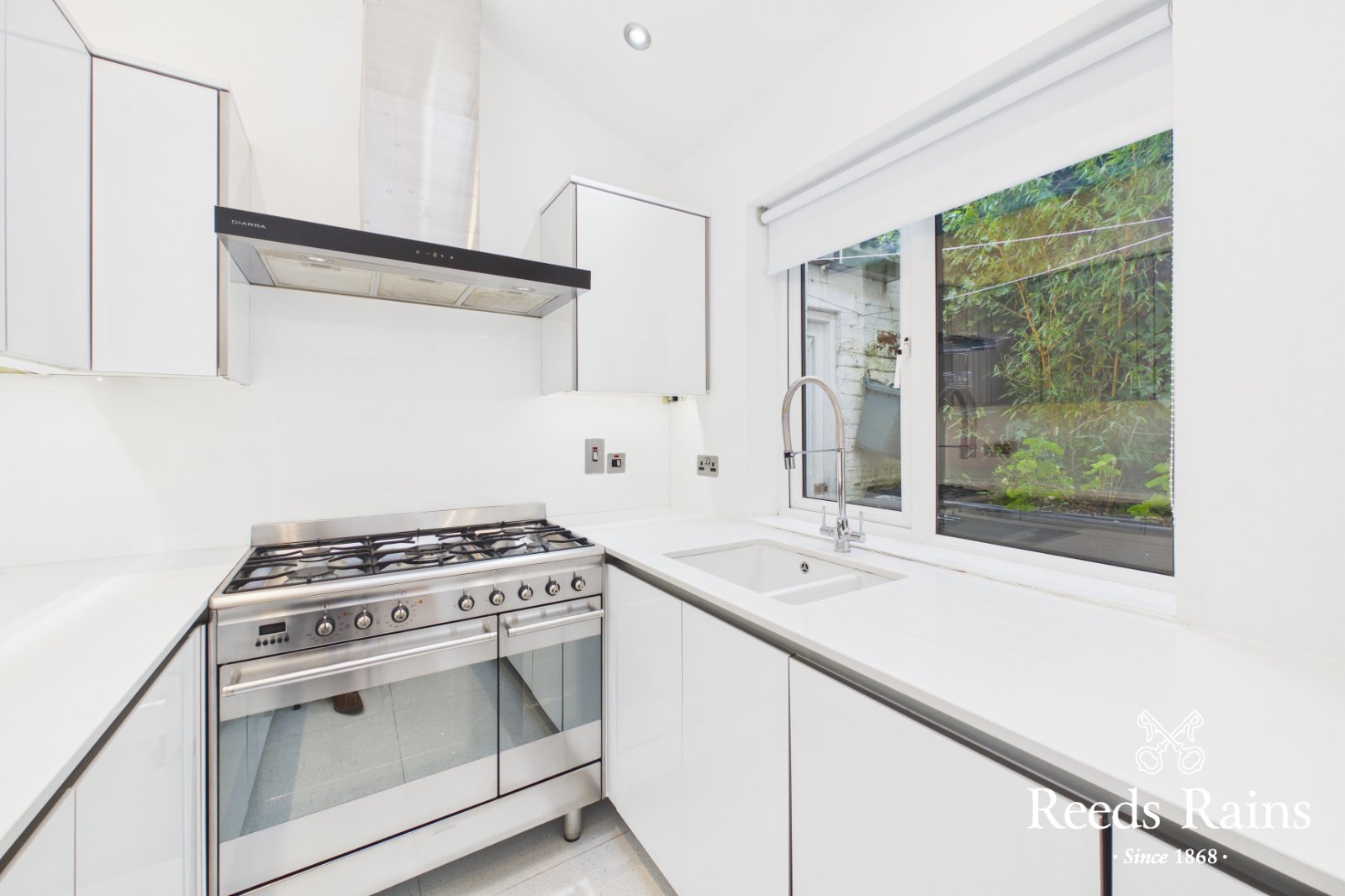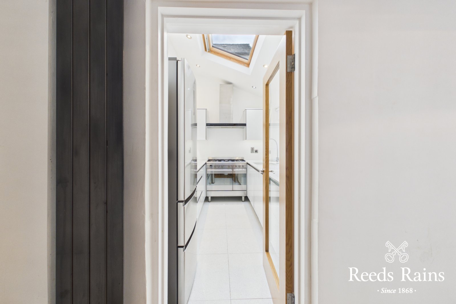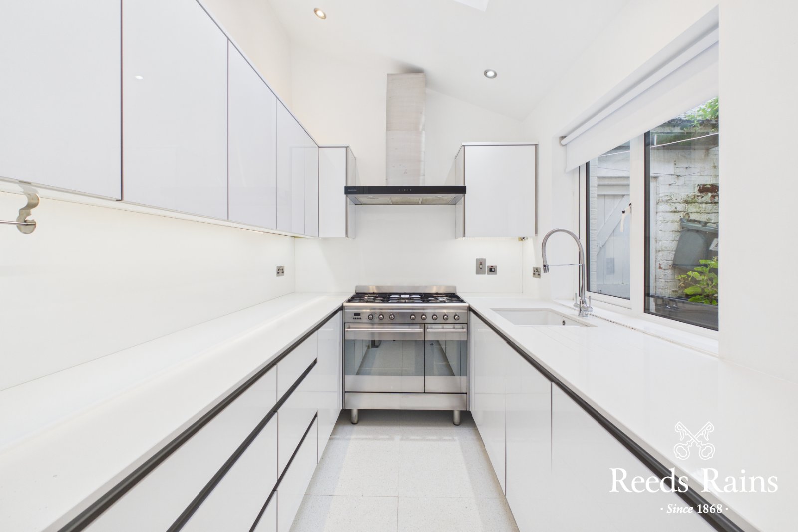 A stunning and recently fitted kitchen, offering Quartz work surfaces, basin with detachable mixer tap integrated appliances, and velux sky light.