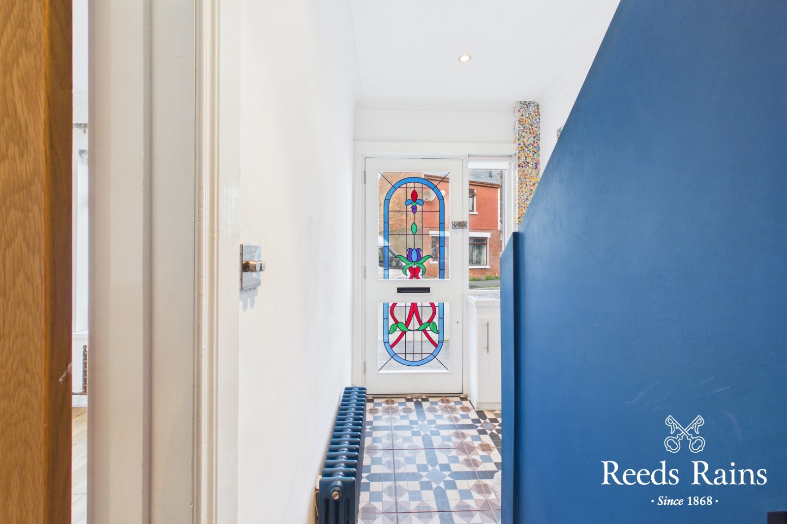 A welcoming entrance hall with a tiled floor and under-stair storage cupboard.