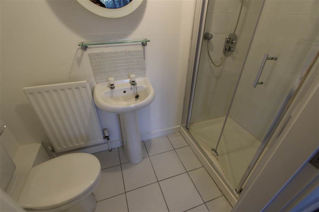 Three piece suite with corner shower with sliding door, wash hand basin and W/C. Tiled flooring and part tiled walls.