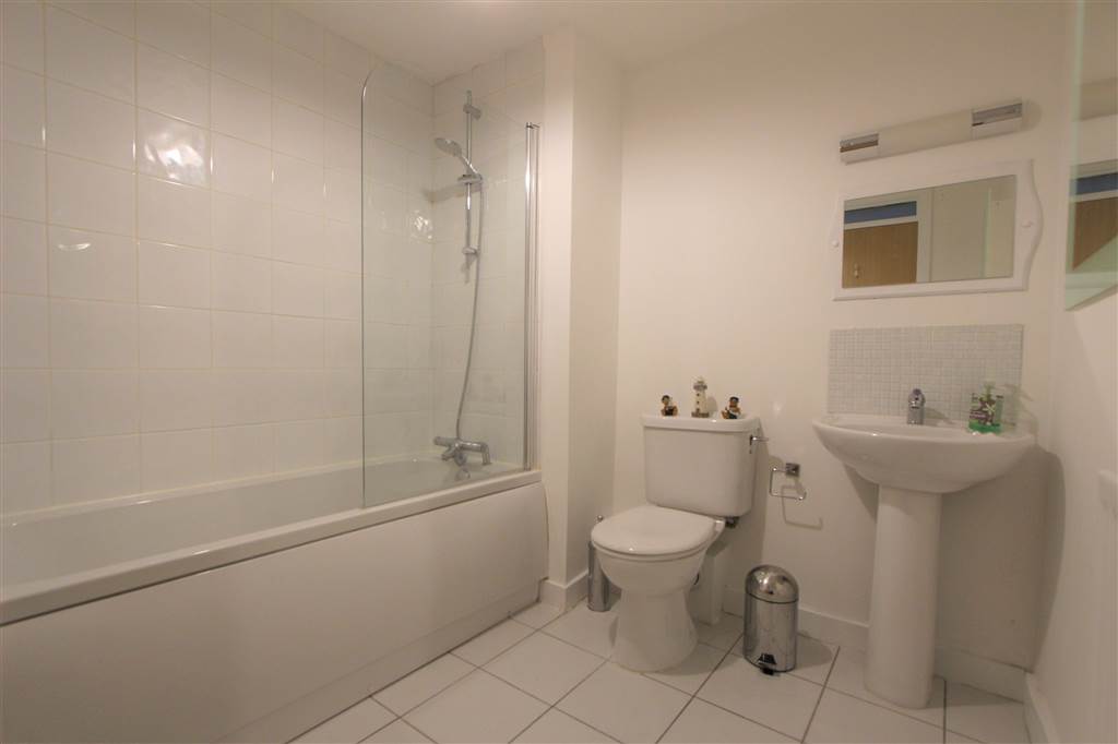 Three piece suite with W/C, wash hand basin, panel bath with glass panel and shower attachment, tiled flooring and part tiled walls.