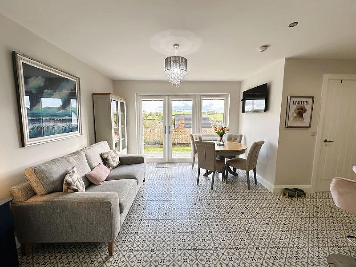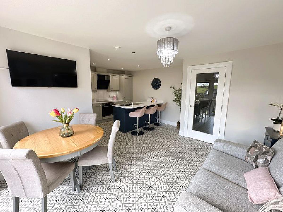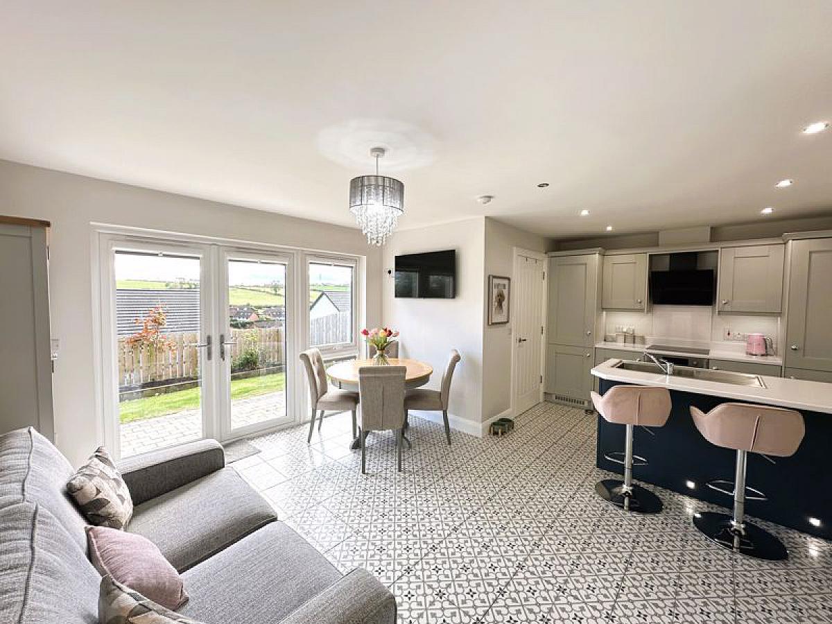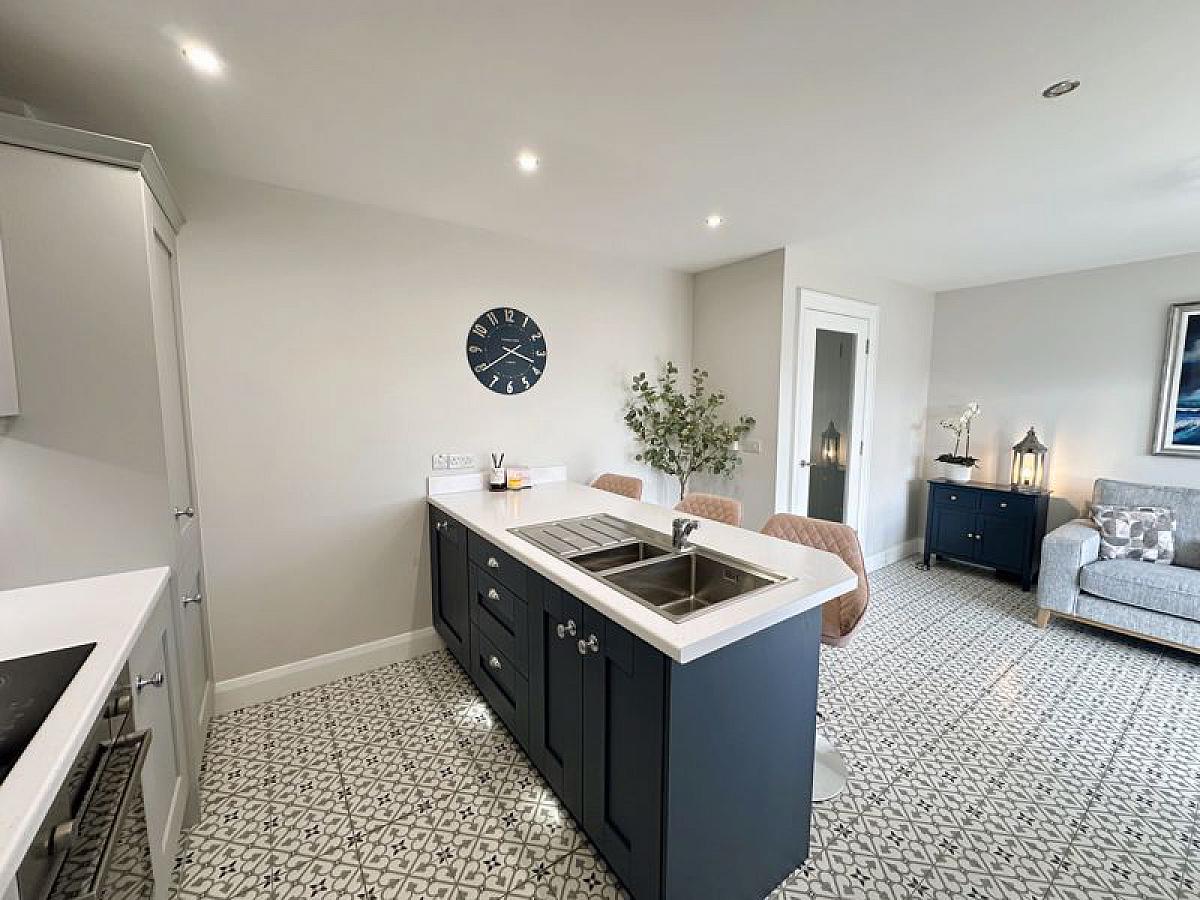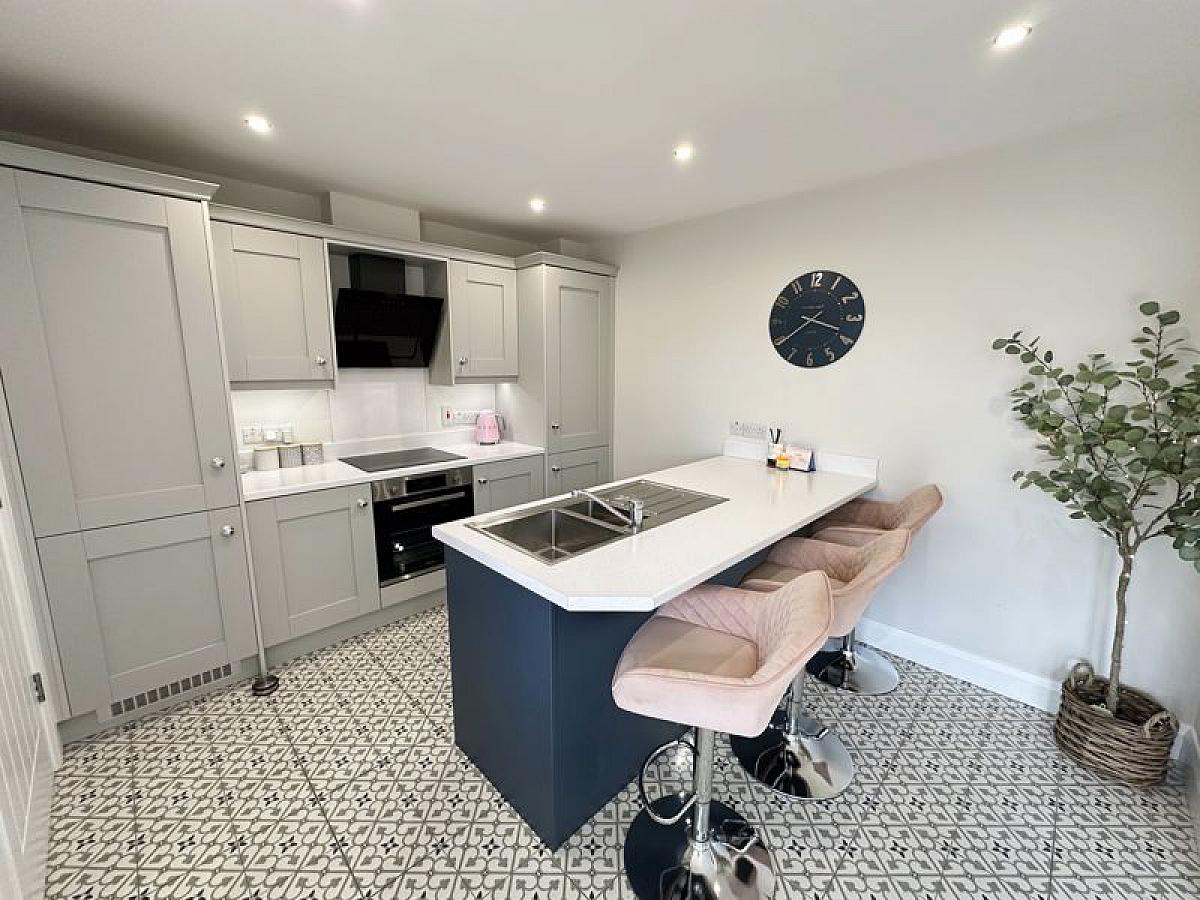 Fitted range of high and low level fitted units and contrasting breakfast bar/island incorporating 1 1/2 bowl stainless steel sink unit and mixer tap. Built-in oven and hob with glass splashback and feature black glass, extractor hood, built-in fridge/freezer and fully integrated dishwasher. Fully tiled floor, TV point, PVC double glazed double doors to patio, recessed ceiling spots, double radiator.