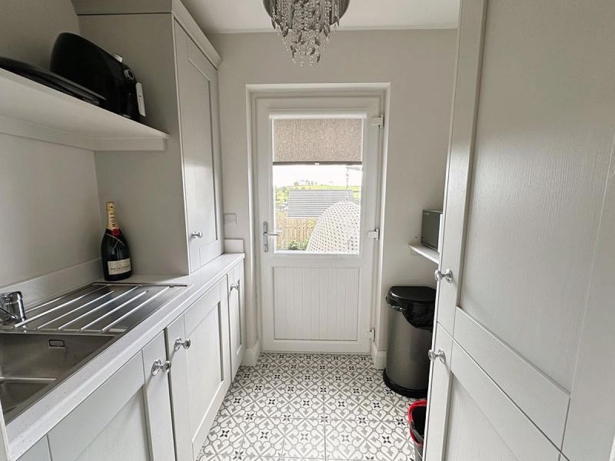 Matching range of units with single drainer stainless steel sink unit and mixer tap, built-in washer/dryer, tiled floor, PVC double glazed back door, 1 radiator.