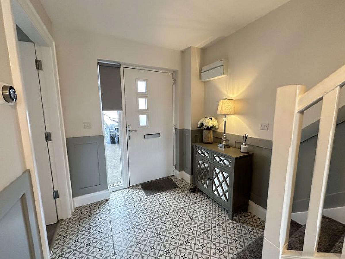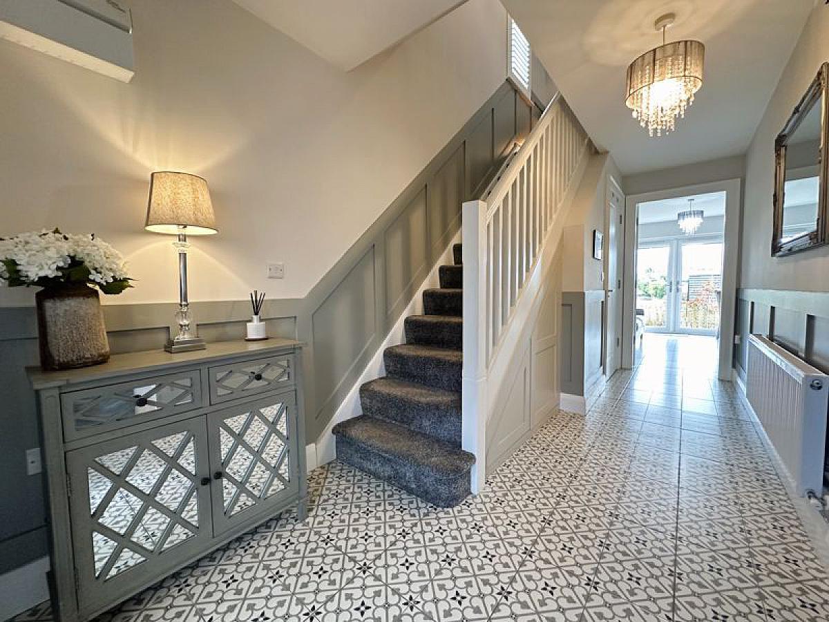 Composite double glazed front door and side screen to fully tiled entrance hall with feature 1/2 panelled walls to hall, stairs and landing, telephone point, 1 radiator.