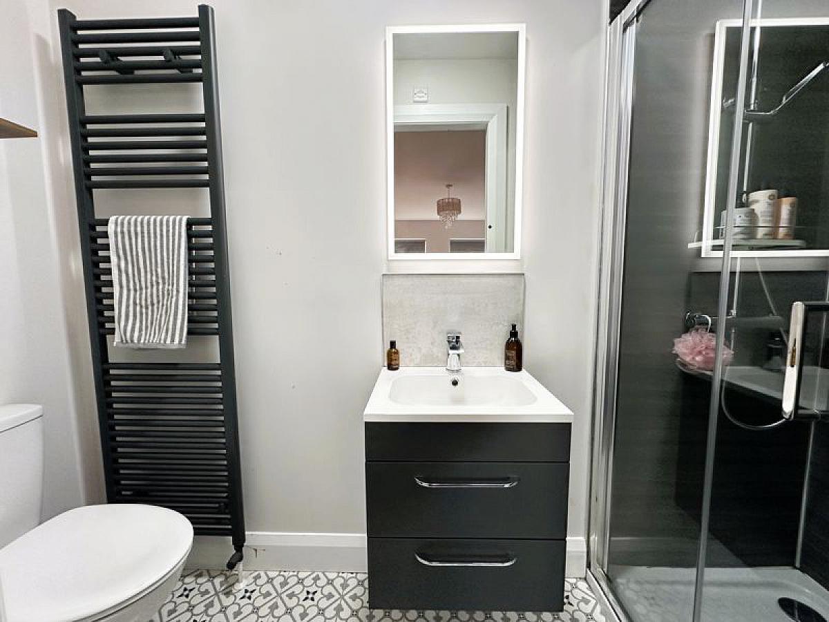 White suite comprising low flush WC, wall hung vanity unit with wash hand basin and mixer tap and panelled shower enclosure with thermostatic mixer shower, hand held and rain shower attachments, tiled floor, anthracite towel rail, wired for LED wall mirror.