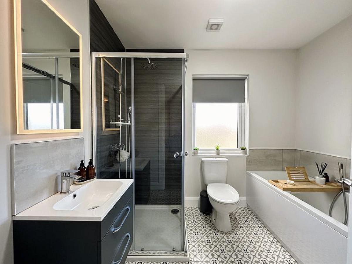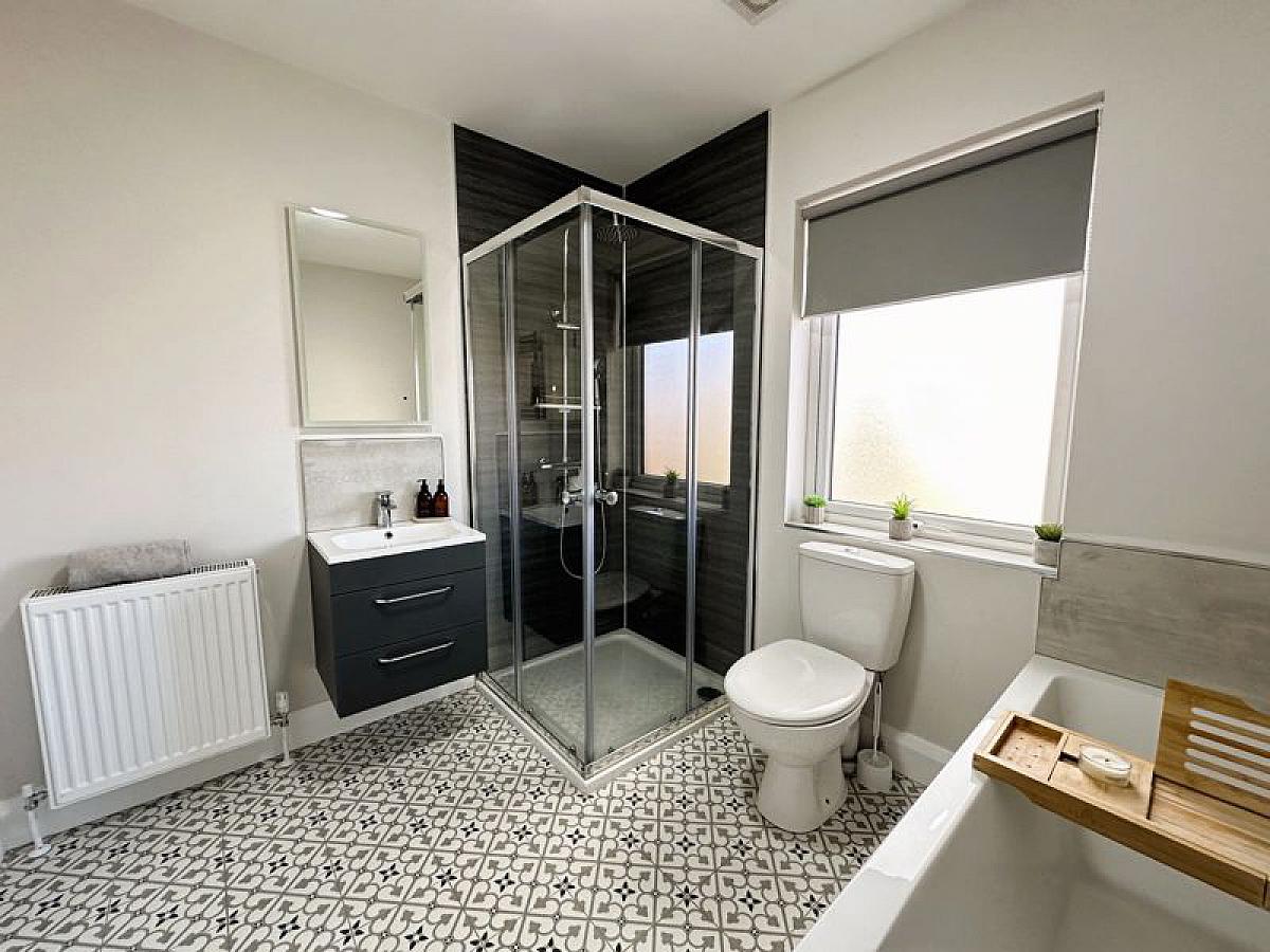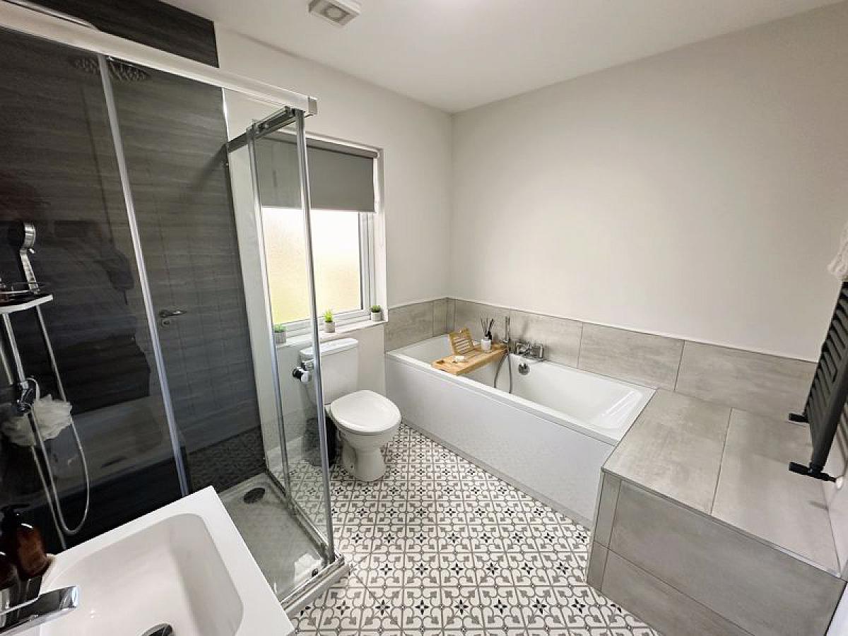 White suite comprising low flush WC, wall hung vanity unit with wash hand basin and mixer tap, panelled bath with centre mixer tap shower attachment and large corner shower cubicle with thermostatic mixer shower, handheld and rain shower attachments, double radiator and anthracite heated towel rail.