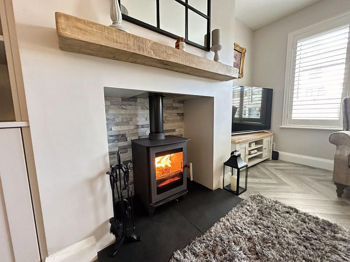 Feature built-in display unit with shelving and storage cupboard, cast iron stove with brick tiled back and hearth, laminate wooden floor, double radiator.