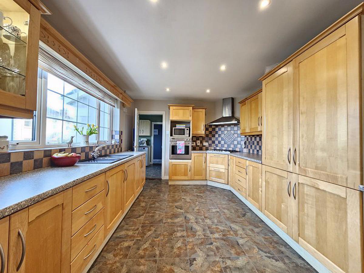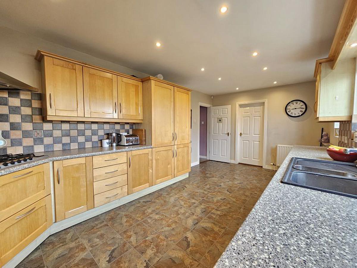 Range of high and low level shaker style units incorporating 1 1/2 bowl sink, gas hob and extractor hood, electric oven, integrated fridge/freezer, dishwasher. Spotlights, tiled floor.