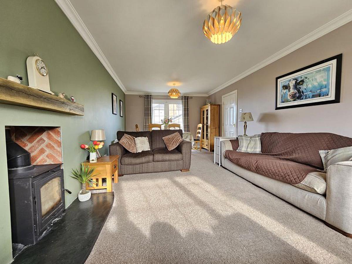 Log burner stove, carpet floor, French doors to rear patio.