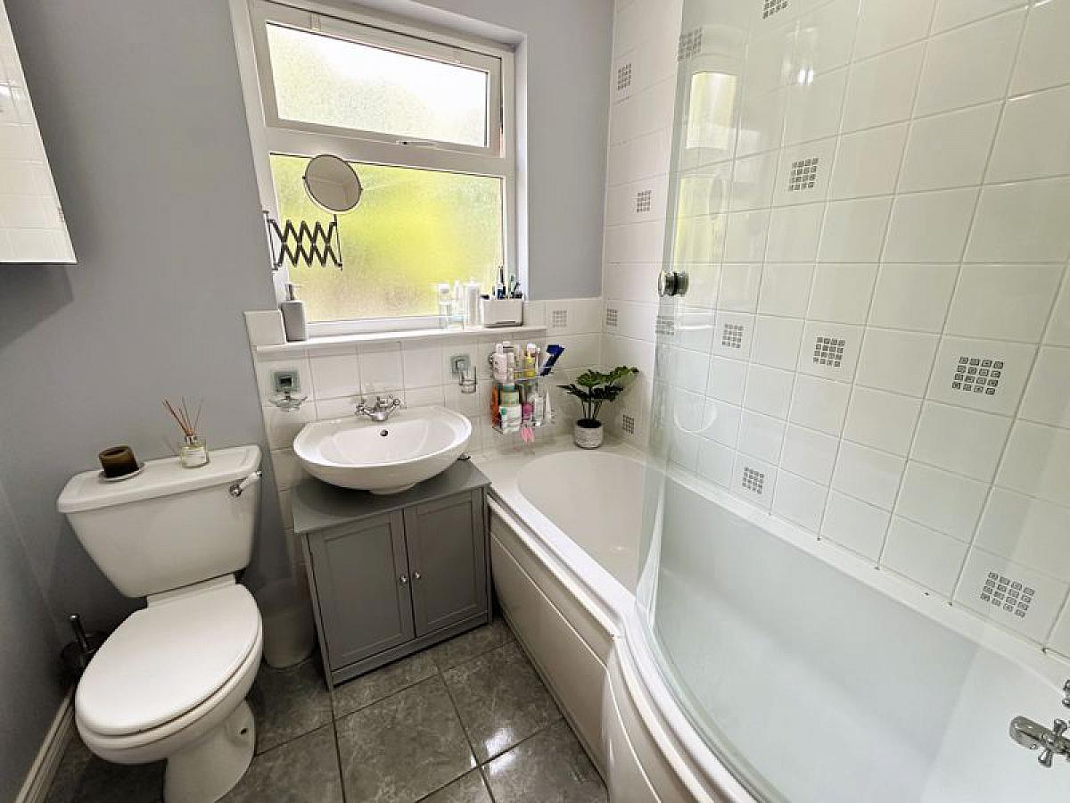 White suite comprising low flush WC, pedestal wash hand basin with mixer tap and shower bath with mixer tap shower attachment and shower screen (also wired for an electric shower unit). Part tiled walls, tiled floor, heated chrome towel rail.