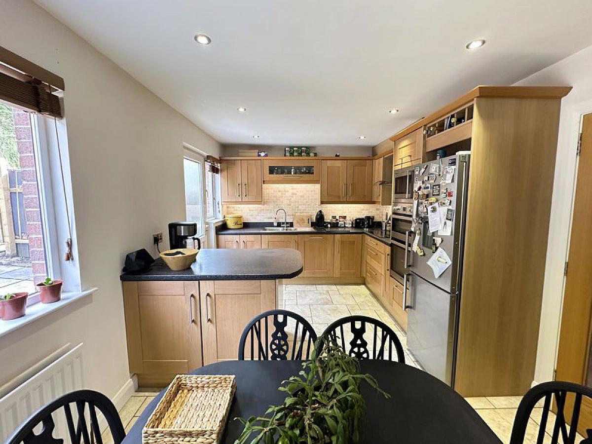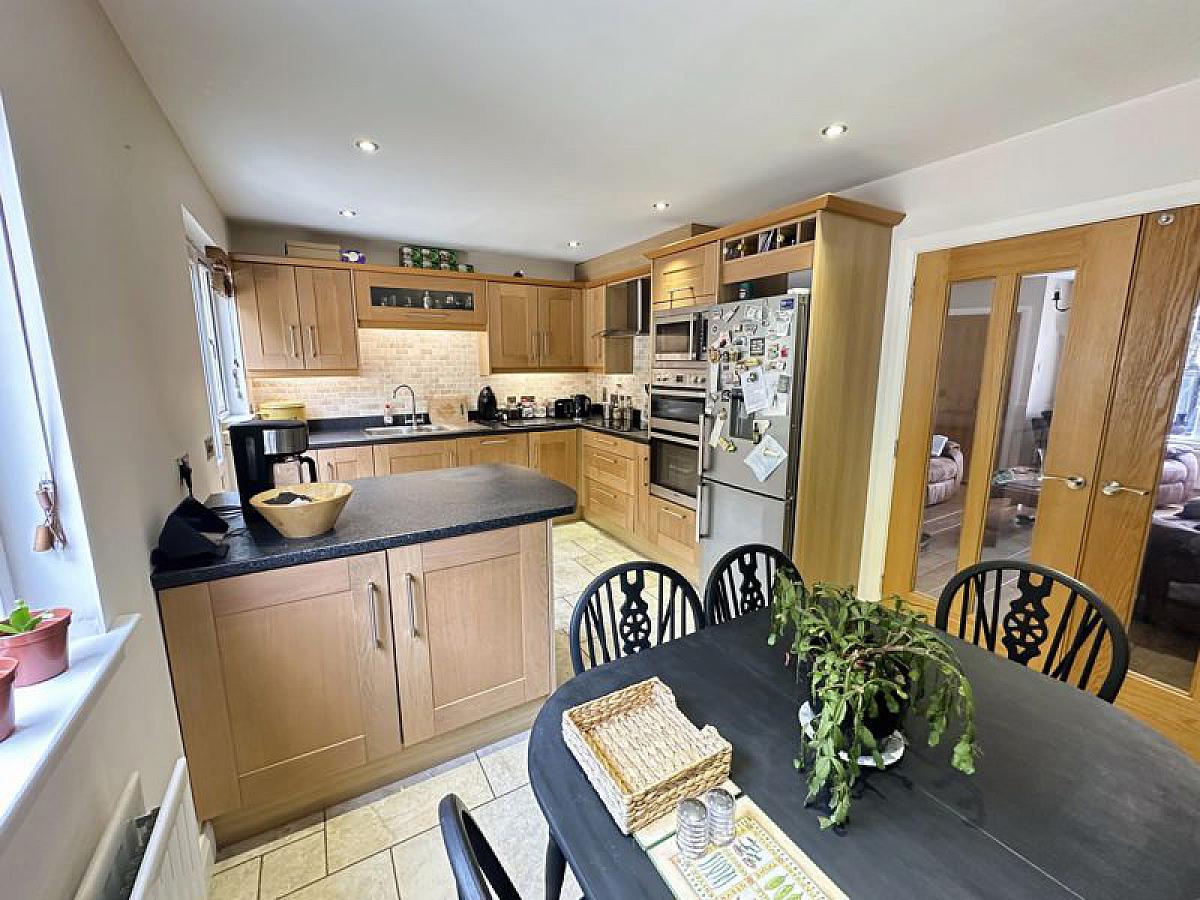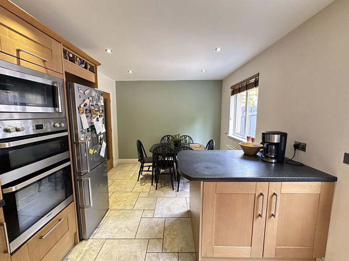 Full range of high and low level fitted oak units with 1 1/2 bowl stainless steel sink unit and mixer tap, glazed display unit, wine rack and worktop lighting. Built-in eye level double oven and ceramic hob with stainless steel extractor hood and fan, built-in microwave, fully integrated dishwasher and space for fridge/freezer. Part tiled walls, fully tiled floor, recessed ceiling spots, PVC double glazed back door, double radiator.