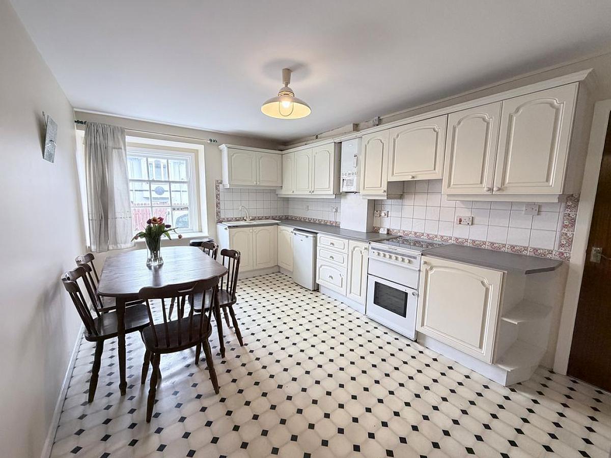 Full range of high and low level fitted units with 1 1/2 bowl stainless steel sink unit and mixer tap, cooker space, fridge/freezer space, part tiled walls, storage cupboard with light, double radiator.
