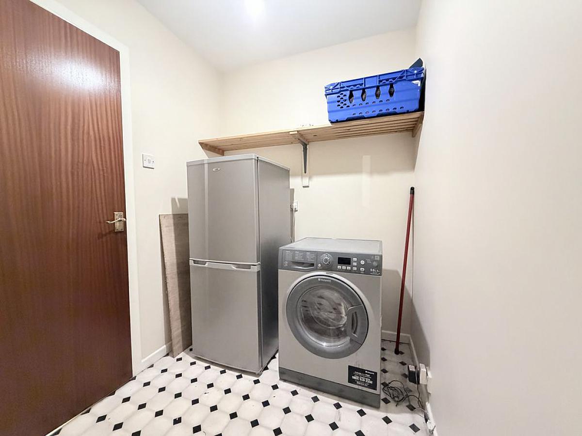 Plumbed for automatic washing machine, space for freezer etc., vinyl floor covering, access door to rear.