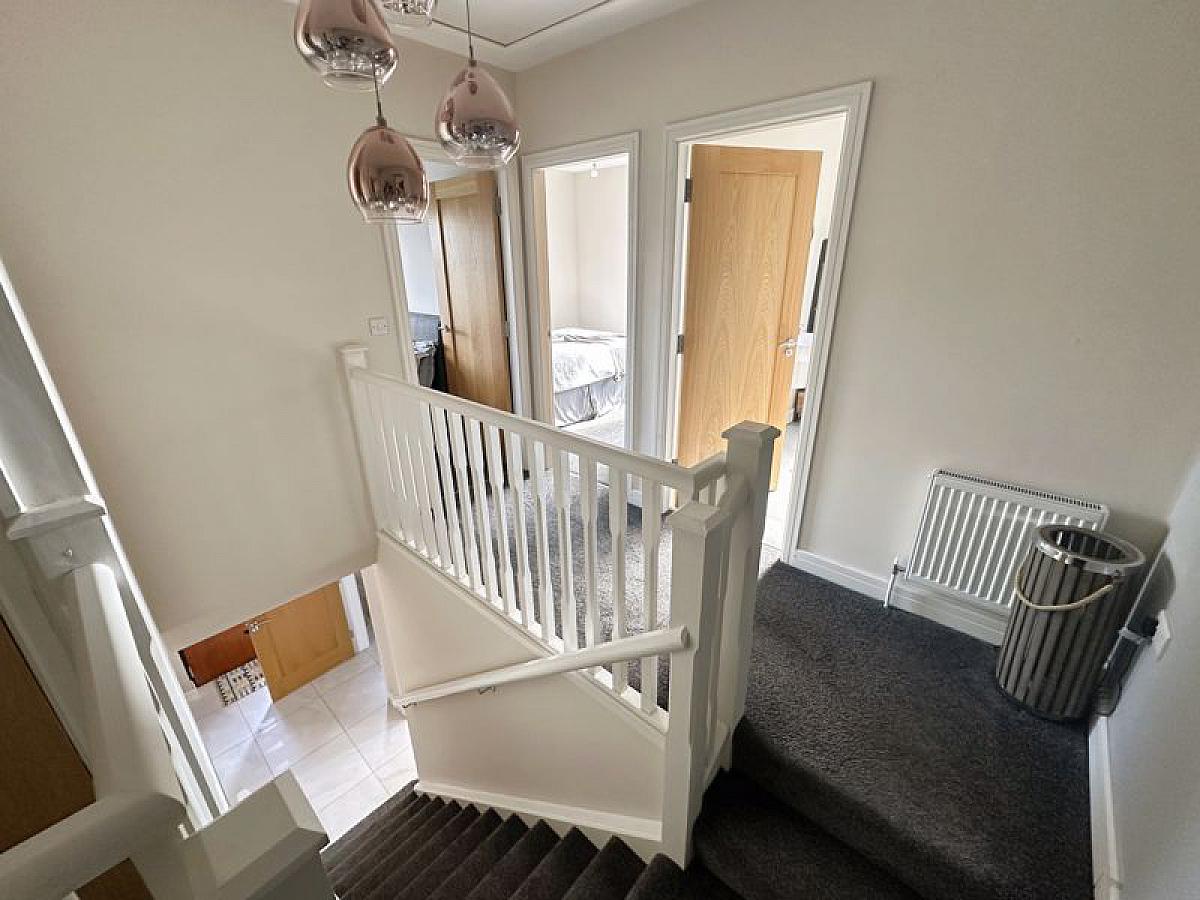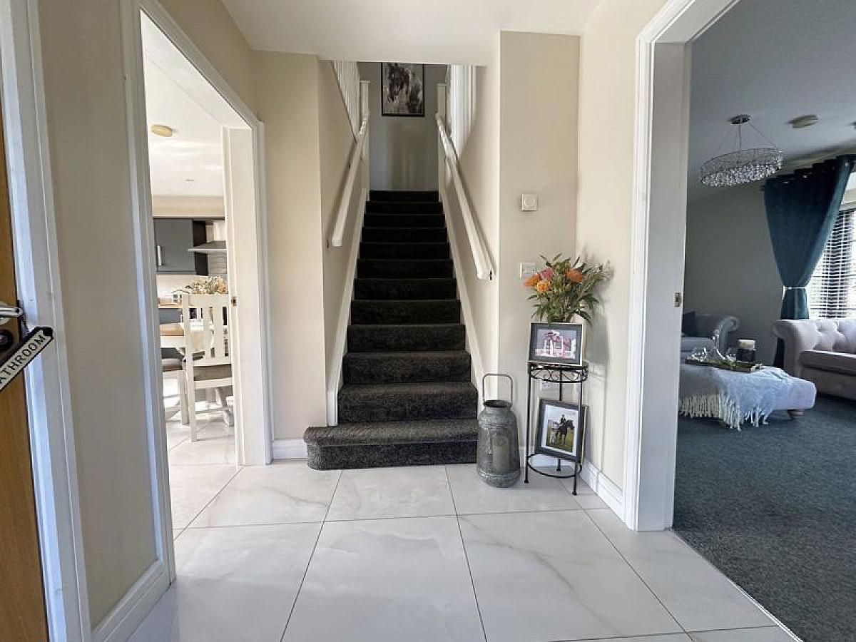 Composite front door with glazed lights and double glazed side panel to tiled entrance hall, double radiator.