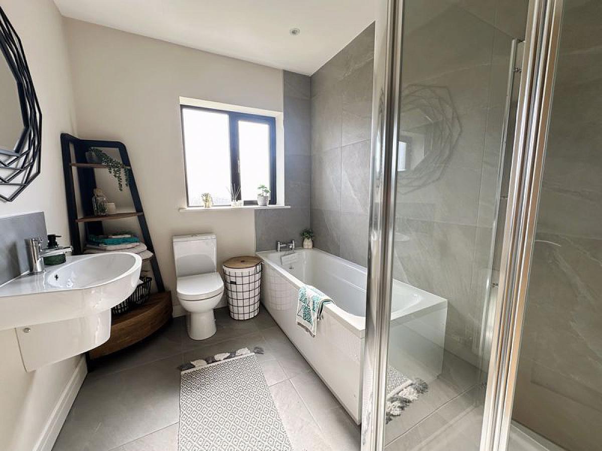 White suite comprising low flush WC, wall hung wash hand basin with mixer tap, panel bath with mixer tap and fully tiled corner shower cubicle with thermostatic mixer shower, part tiled walls, fully tiled floor, recessed ceiling spots, 1 radiator.