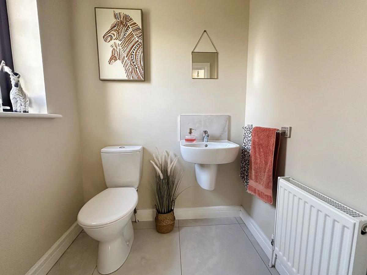 With low flush WC and wall hung wash hand basin and mixer tap, tiled floor, 1 radiator.