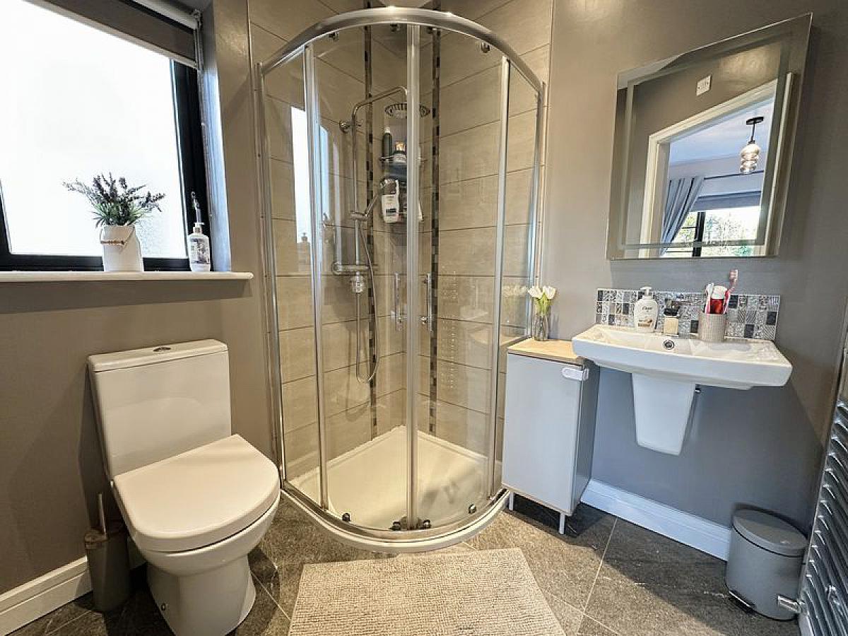 White suite comprising low flush WC, wall hung wash hand basin with mixer tap and fully tiled quadrant shower cubicle with thermostatic rain shower head and separate handheld shower head. Fully tiled floor, recessed ceiling spots, heated chrome towel rail.