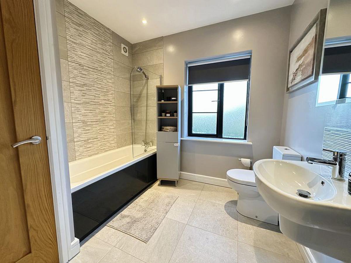 White suite comprising low flush WC, wall hung wash hand basin with mixer tap and panel bath with mixer tap shower attachment and shower screen. Part tiled walls, fully tiled floor, heated chrome towel rail, recessed ceiling spots, airing cupboard.