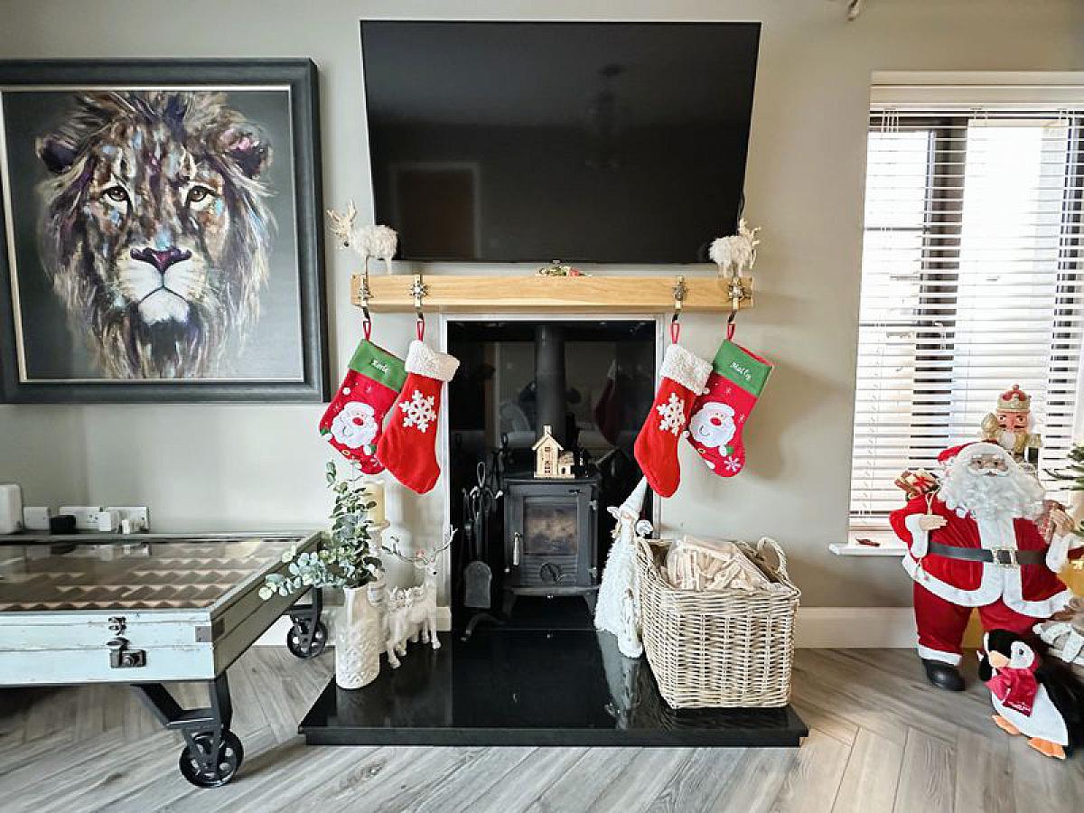 Feature cast iron stove with granite hearth and tiled surround, Herringbone laminate wooden floor, TV lead, telephone point, double radiator.