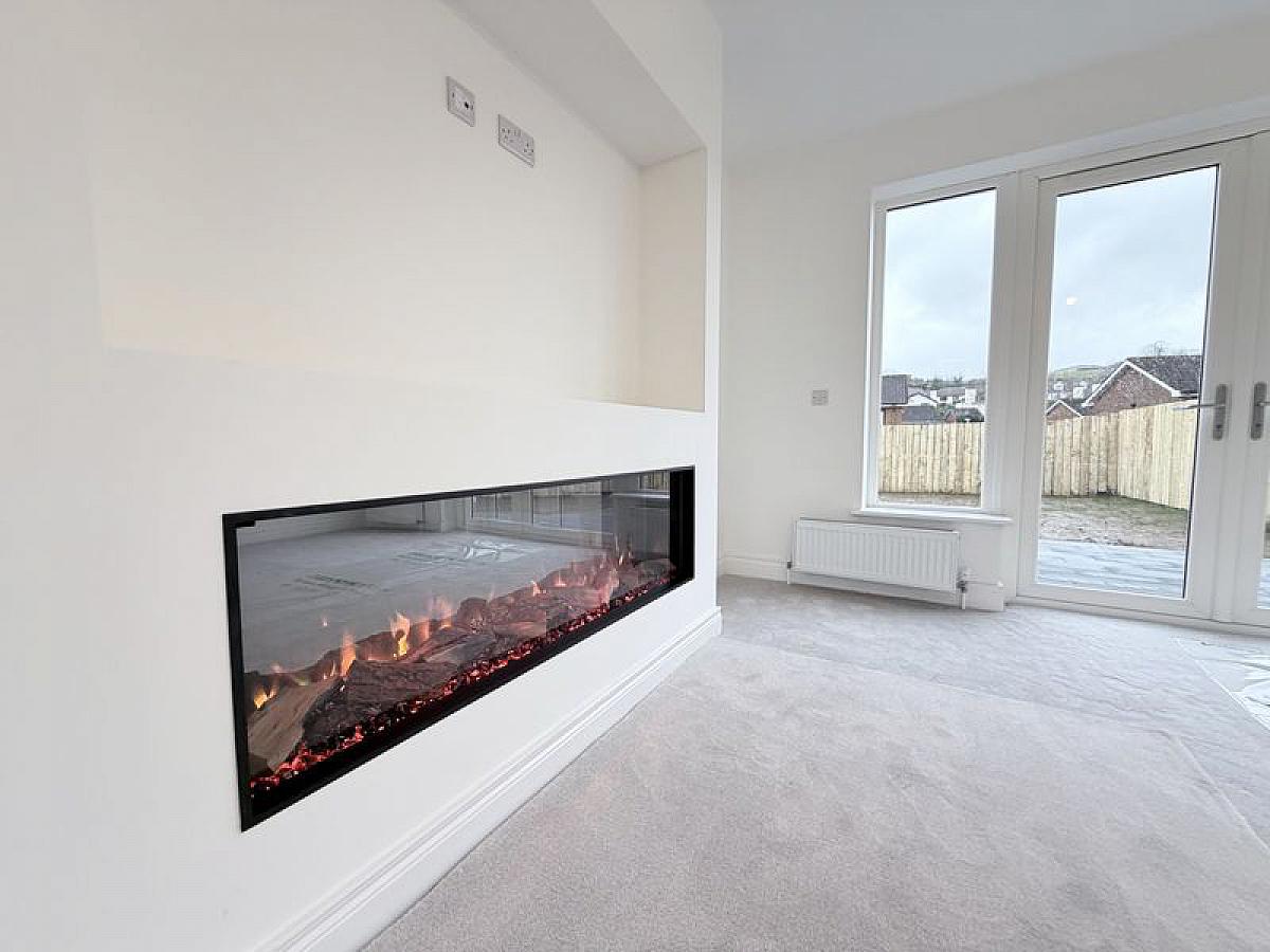 Media wall with TV inset and feature LED flame effect electric fire, 5 amp plug sockets, PVC double glazed doors to rear patio.