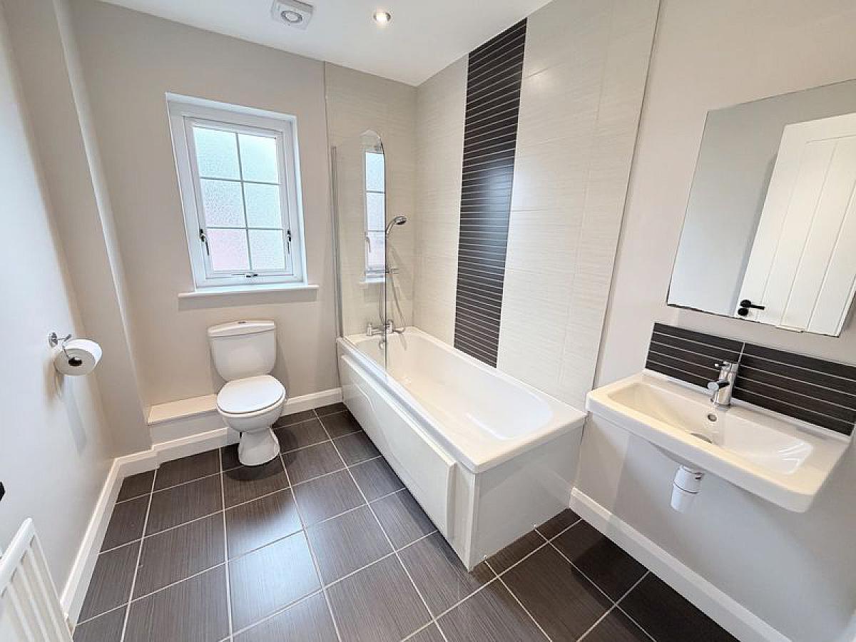 White suite comprising low flush WC, wall mounted wash hand basin with mixer tap and panel bath with mixer tap and wall mounted thermostatic shower mixer and shower screen. Part tiled walls, fully tiled floor, recessed ceiling spots, double radiator.