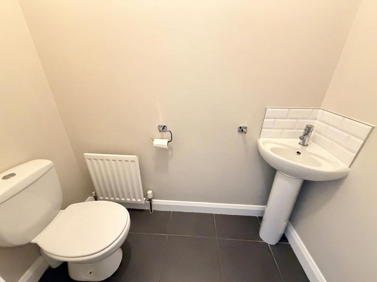 With low flush WC and pedestal wash hand basin with mixer tap, tiled floor, 1 radiator.