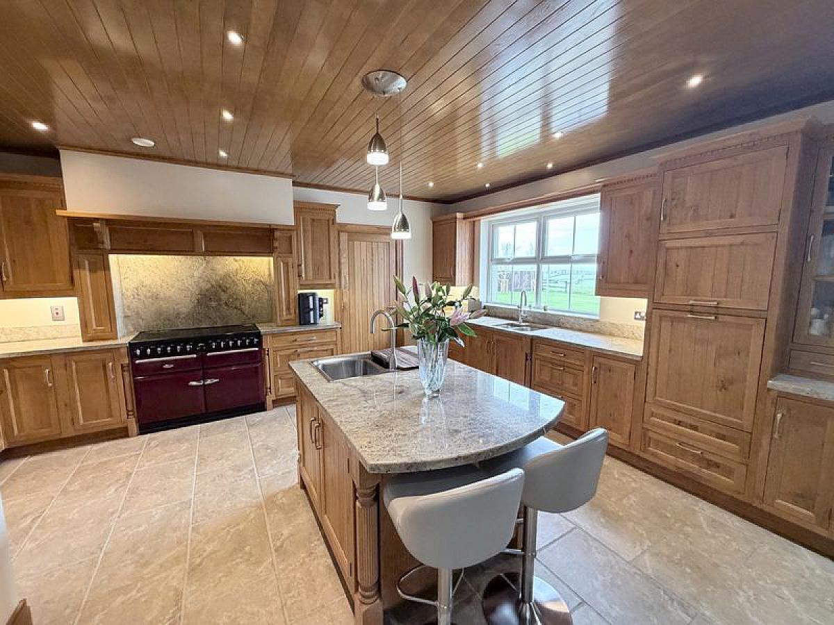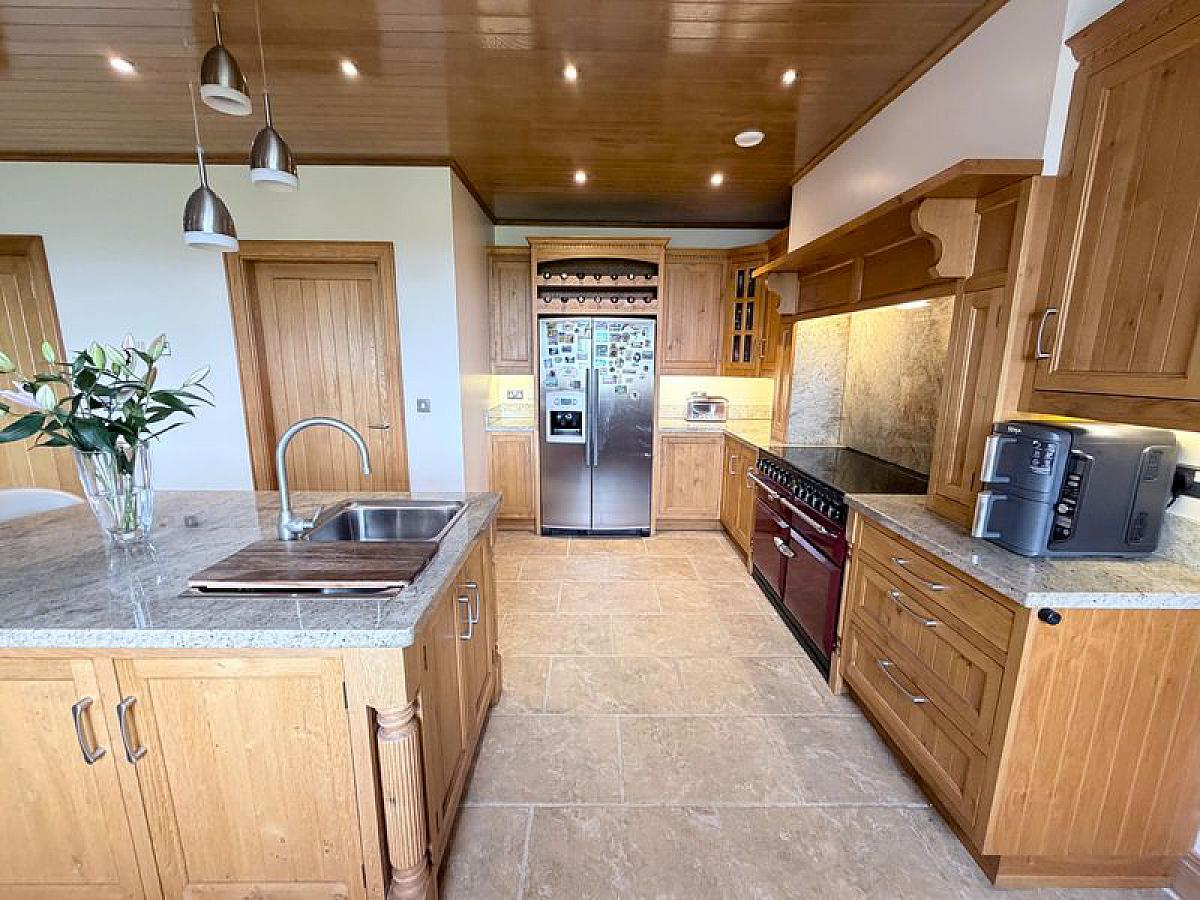 Full range of high and low level fitted inset oak units with granite worktops and upstands incorporating 1 1/2 bowl stainless steel sink unit and Quooker hot water tap, Window pelmet and glazed display unit, matching island unit with 1 3/4 bowl stainless steel sink unit and mixer tap. Stanley electric range with induction hob, surround, extractor hood and downlighting, housing for American style fridge/freezer with wine rack, fully integrated dishwasher and concealed microwave space. Worktop lighting, fully tiled floor, oak panelled ceiling with recessed ceiling spots, walk-in shelved pantry with light, open plan to