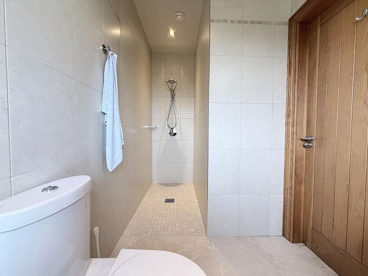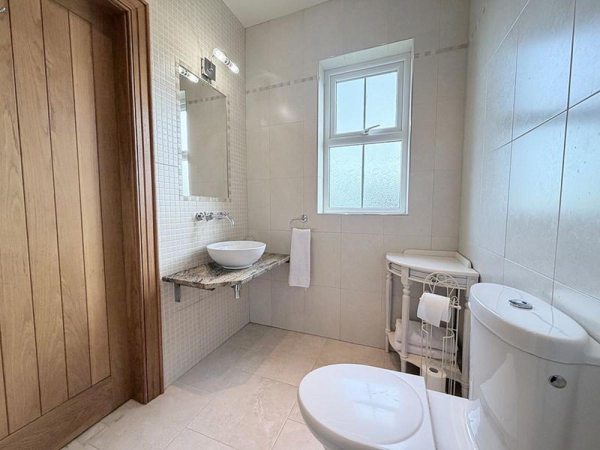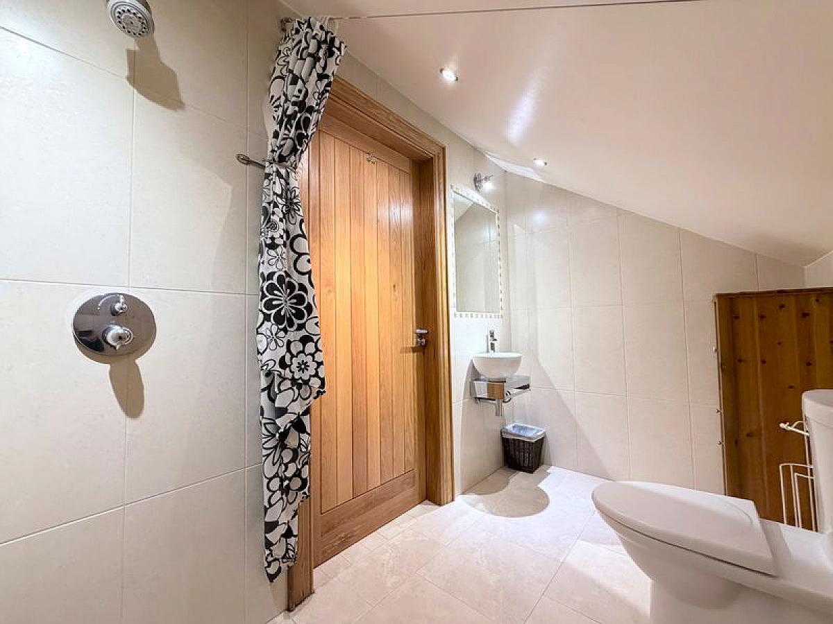 With close coupled WC, wall mounted wash hand basin and thermostatic mixer shower, fully tiled walls and floor, fully tiled walls and floor, recessed ceiling spots.