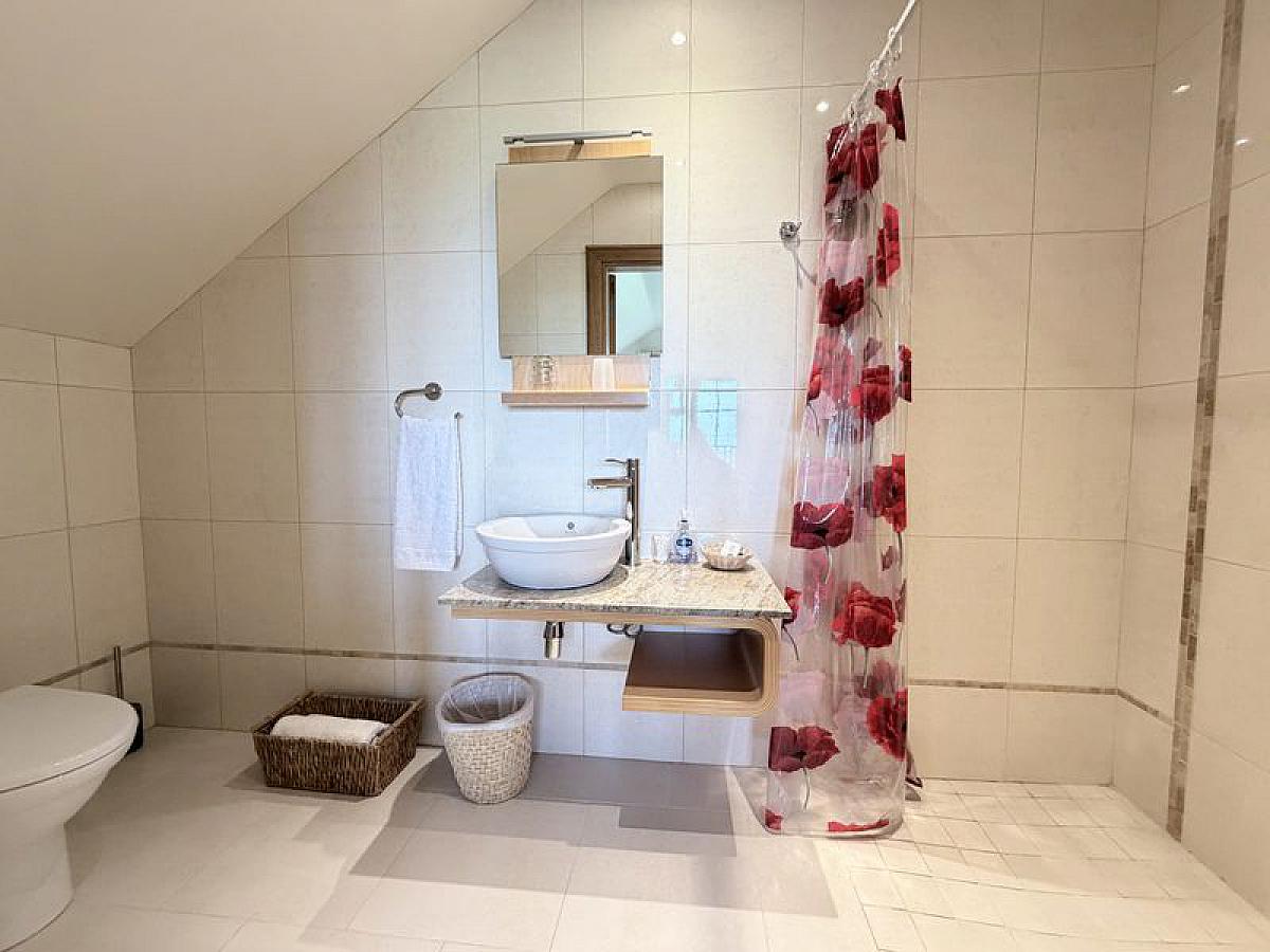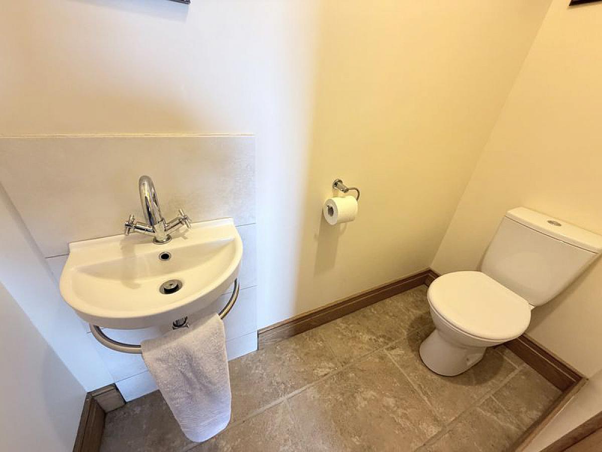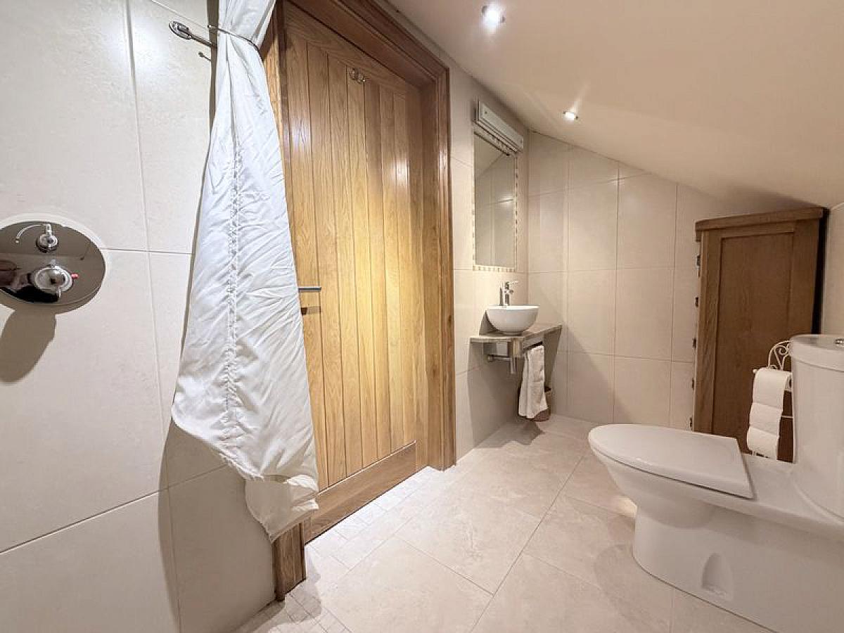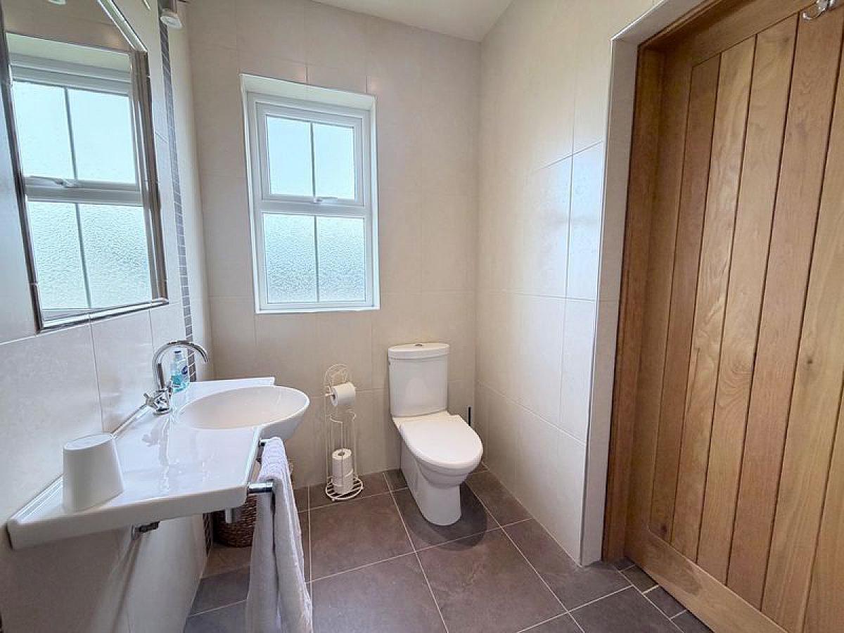 With close coupled WC, wall mounted wash hand basin and thermostatic mixer shower, fully tiled walls and floor, fully tiled walls and floor, recessed ceiling spots.