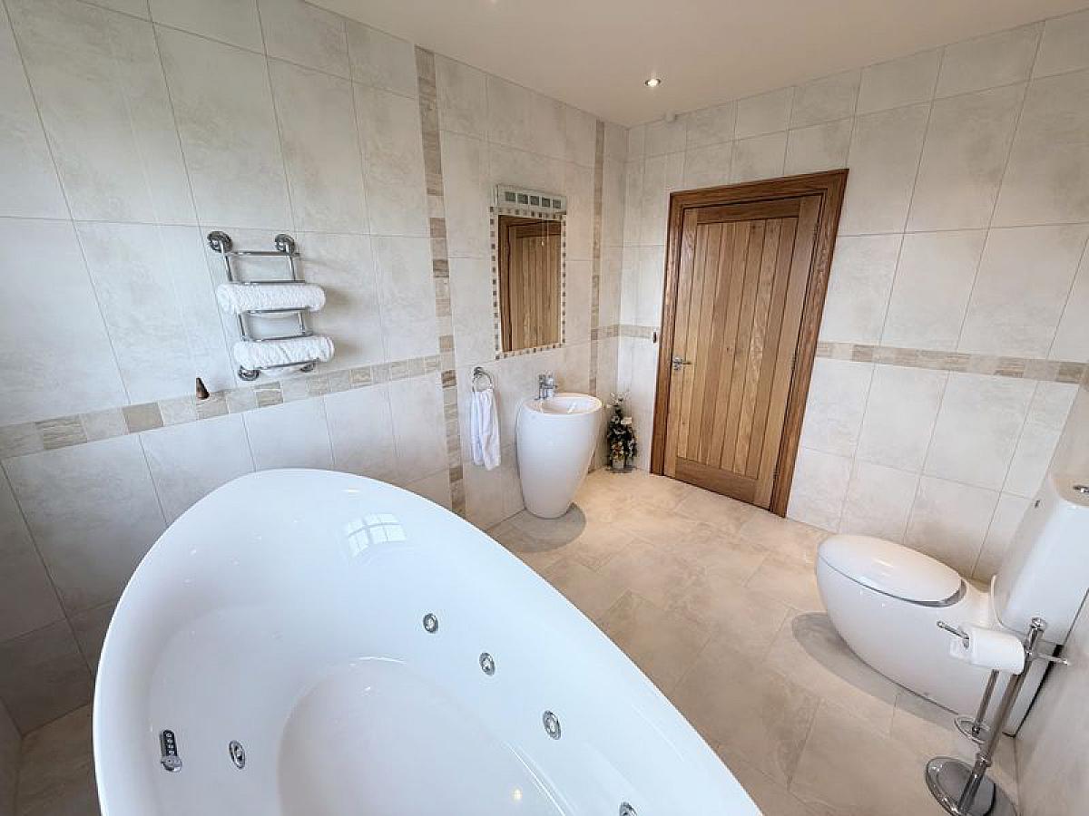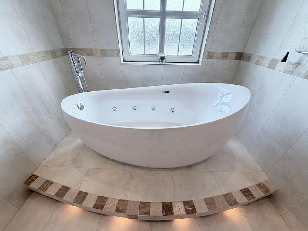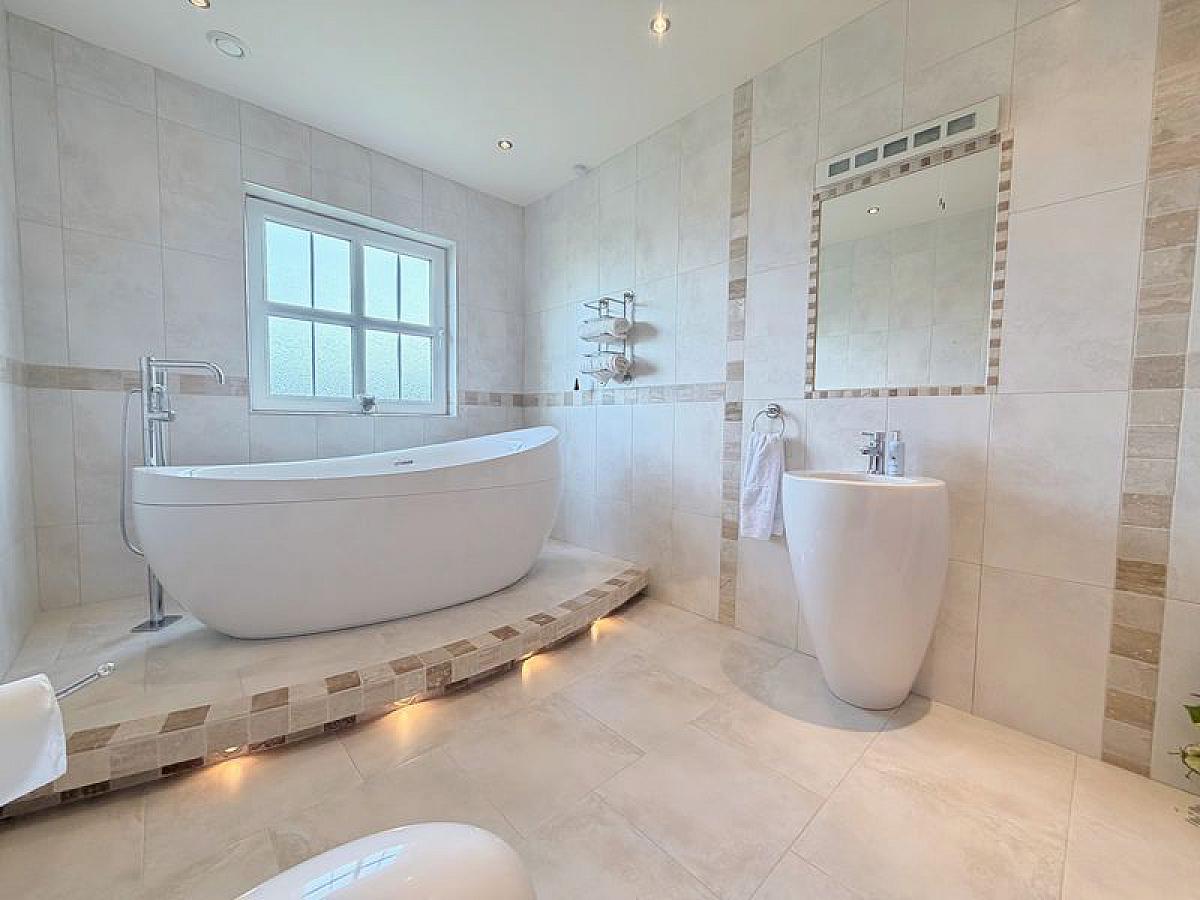 Luxury white suite with close coupled WC, feature floor up ceramic sink unit with mixer tap and freestanding jacuzzi style bath bath and floor mounted mixer tap with shower head attachment on raised plinth floor with feature lighting, fully tiled walls and floor, recessed ceiling spots.