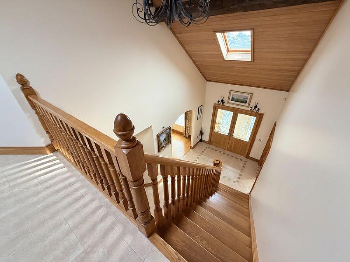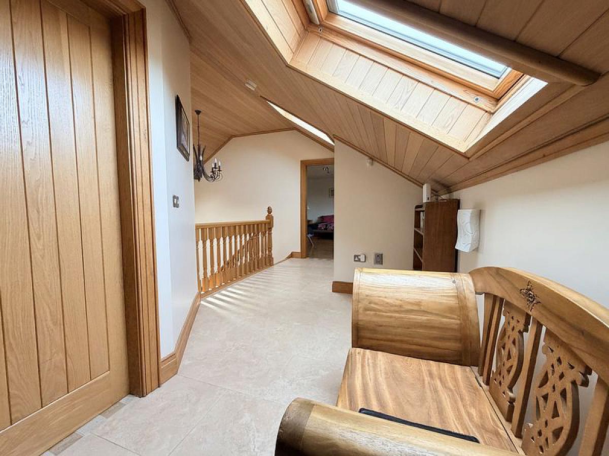 Glazed double oak doors to spacious fully tiled reception hall, oak staircase to gallery landing, tongue and groove panelled oak ceiling, twin double glazed Velux rooflights.