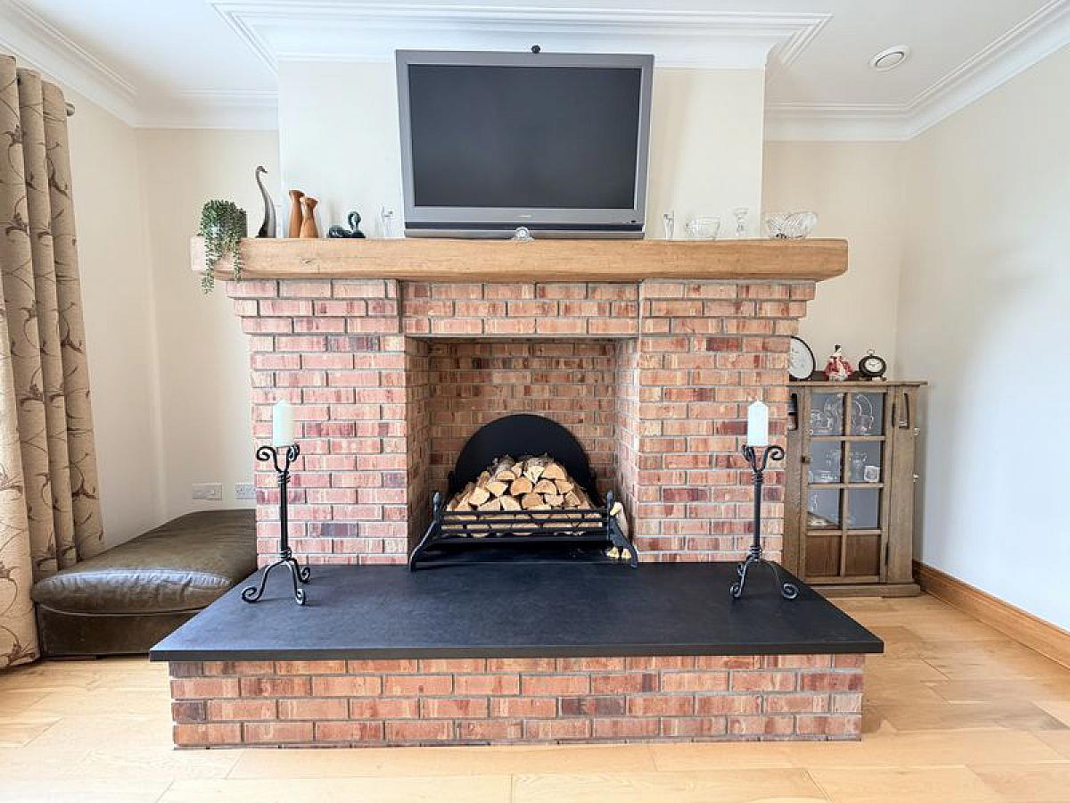 Glazed oak double doors from hall, feature brick built inglenook style fireplace, slate hearth and oak sleeper mantel, oak wooden floor, coved ceiling and 3 wall light points.