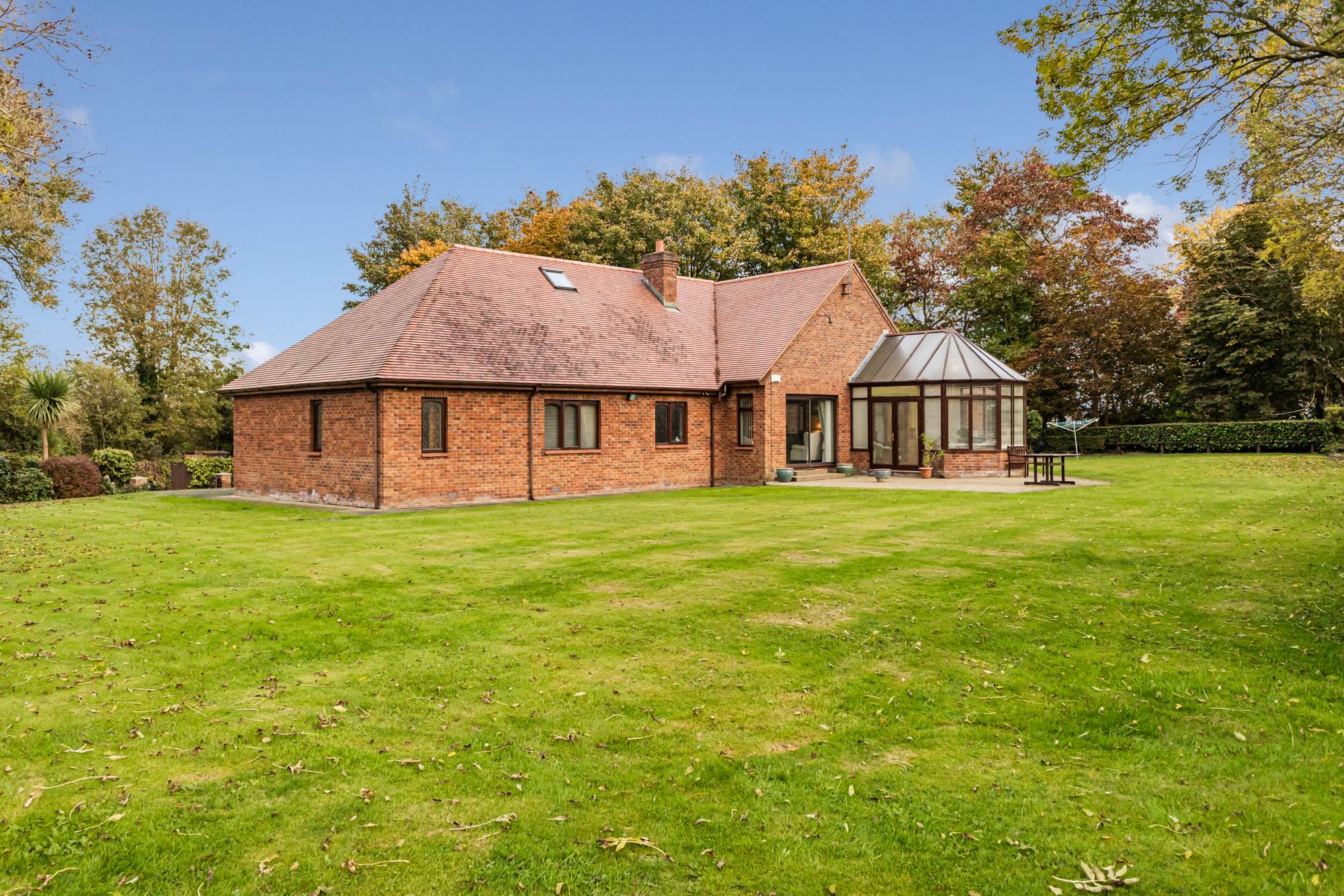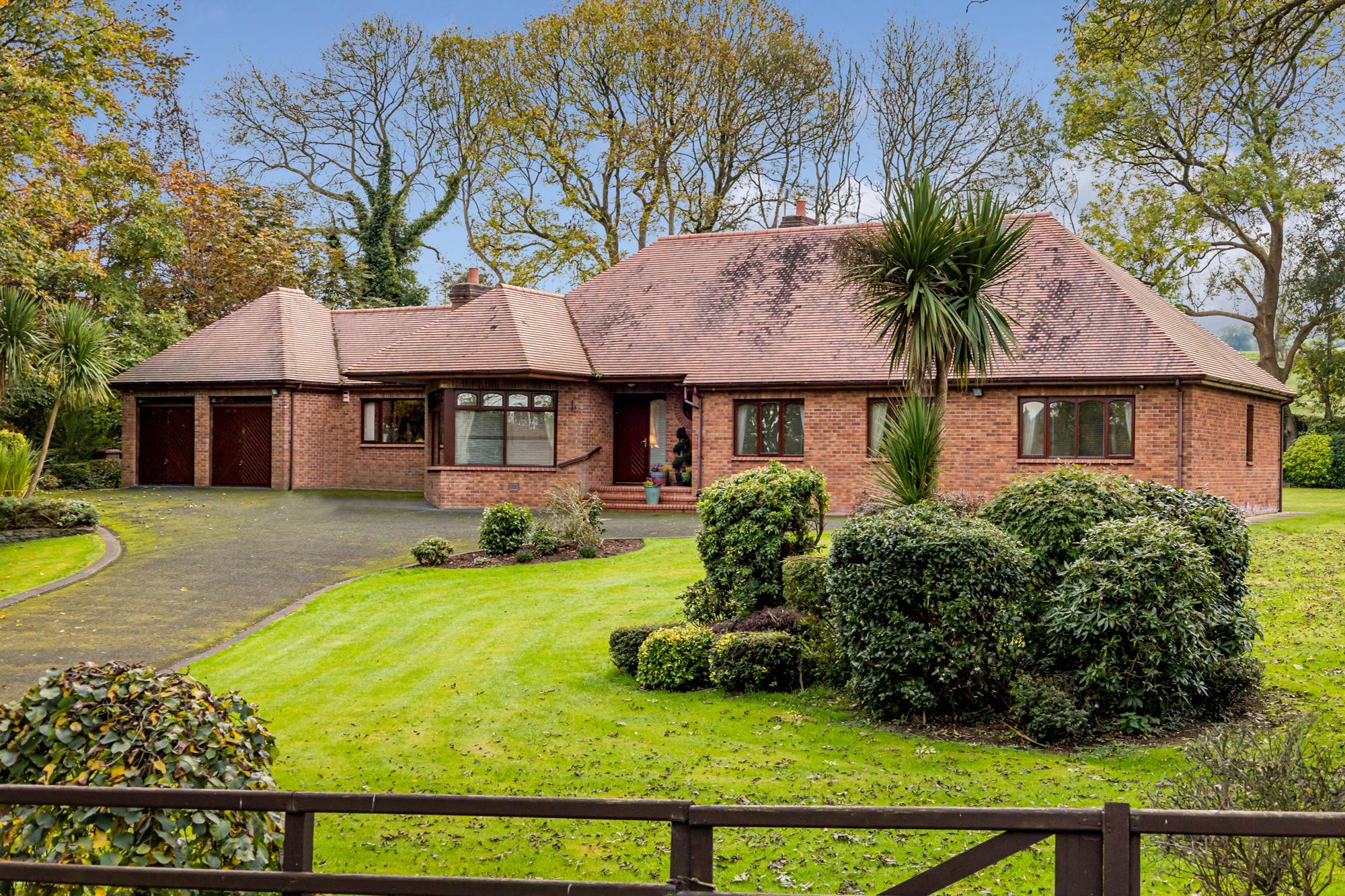 Externally, a sweeping tarmac driveway leads to extensive private landscaped gardens that surround the property, offering privacy, mature planting, and space to enjoy the outdoors.