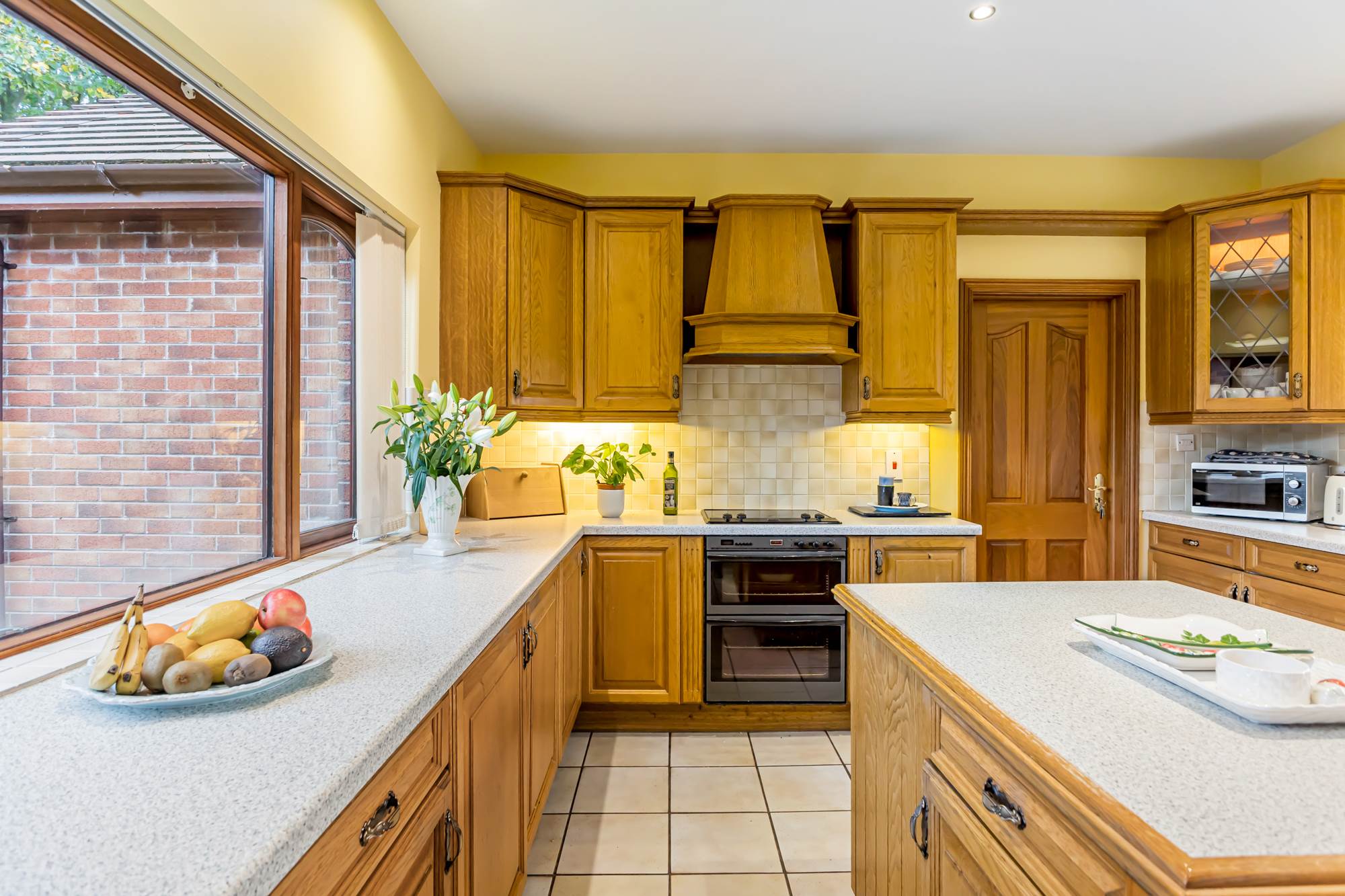 (at widest points). Fitted kitchen with range of high and low level worktops, laminate work surfaces, stainless steel single drainer sink unit mixer taps, built-in ceramic hob with built-in oven and grill and extractor fan. Part tiled walls, tiled floor, built-in dishwasher, space for washing machine. Mature outlook to rear garden and front garden. Breakfast island with range of units, low voltage spotlights. Glass cabinet.