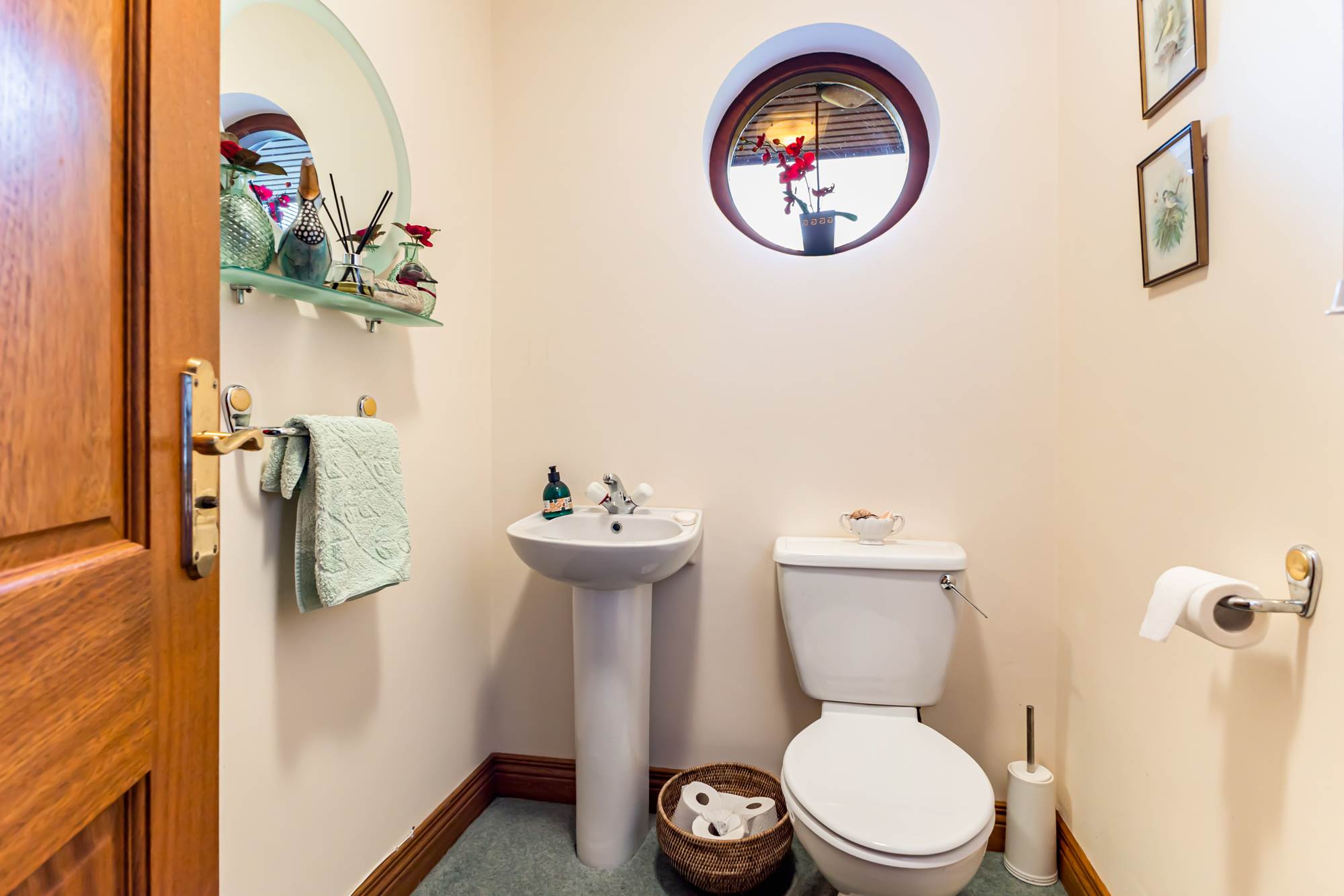 White suite comprising low flush wc, pedestal wash hand basin, access to electric meter and alarm panel. Circular window.