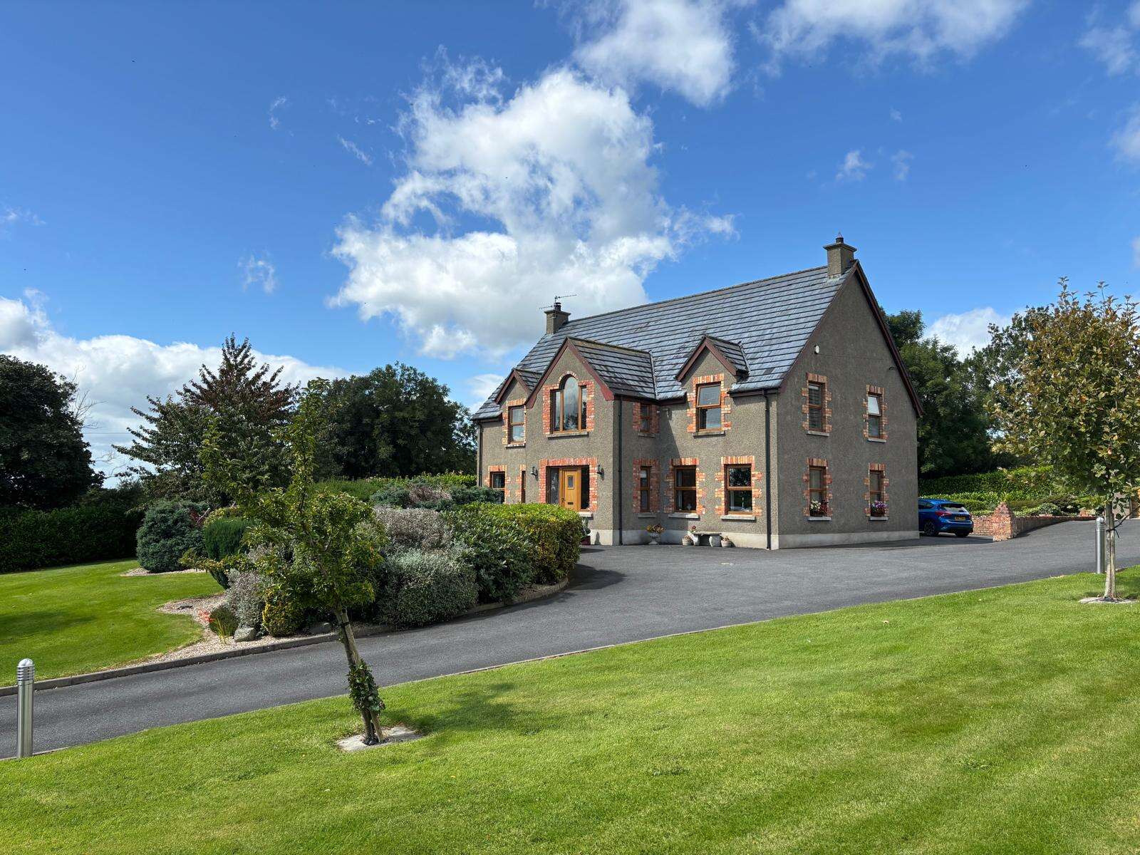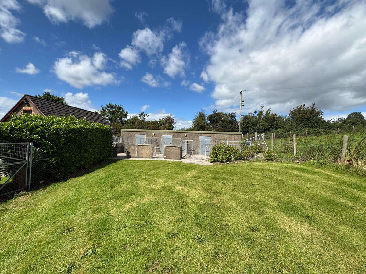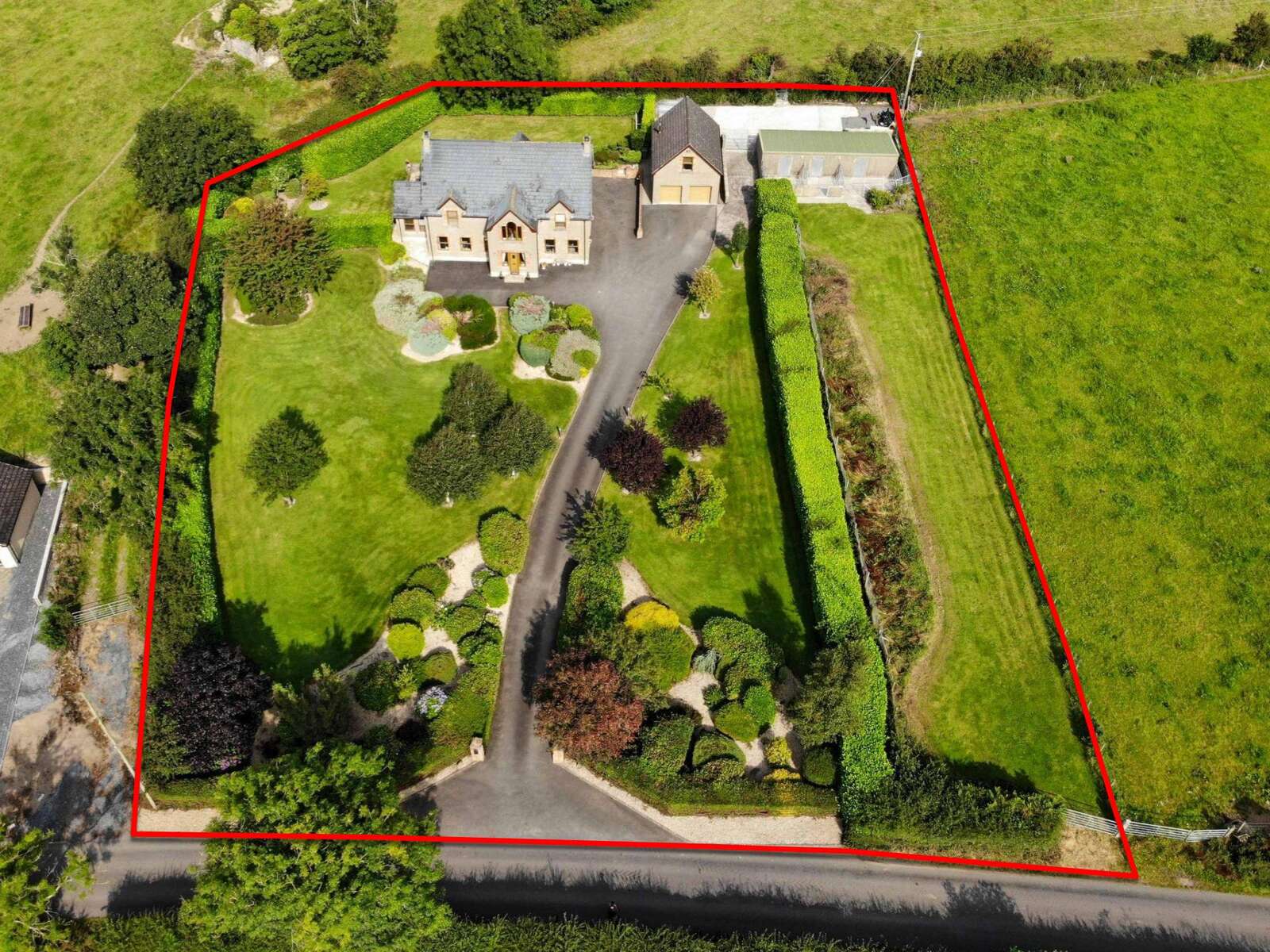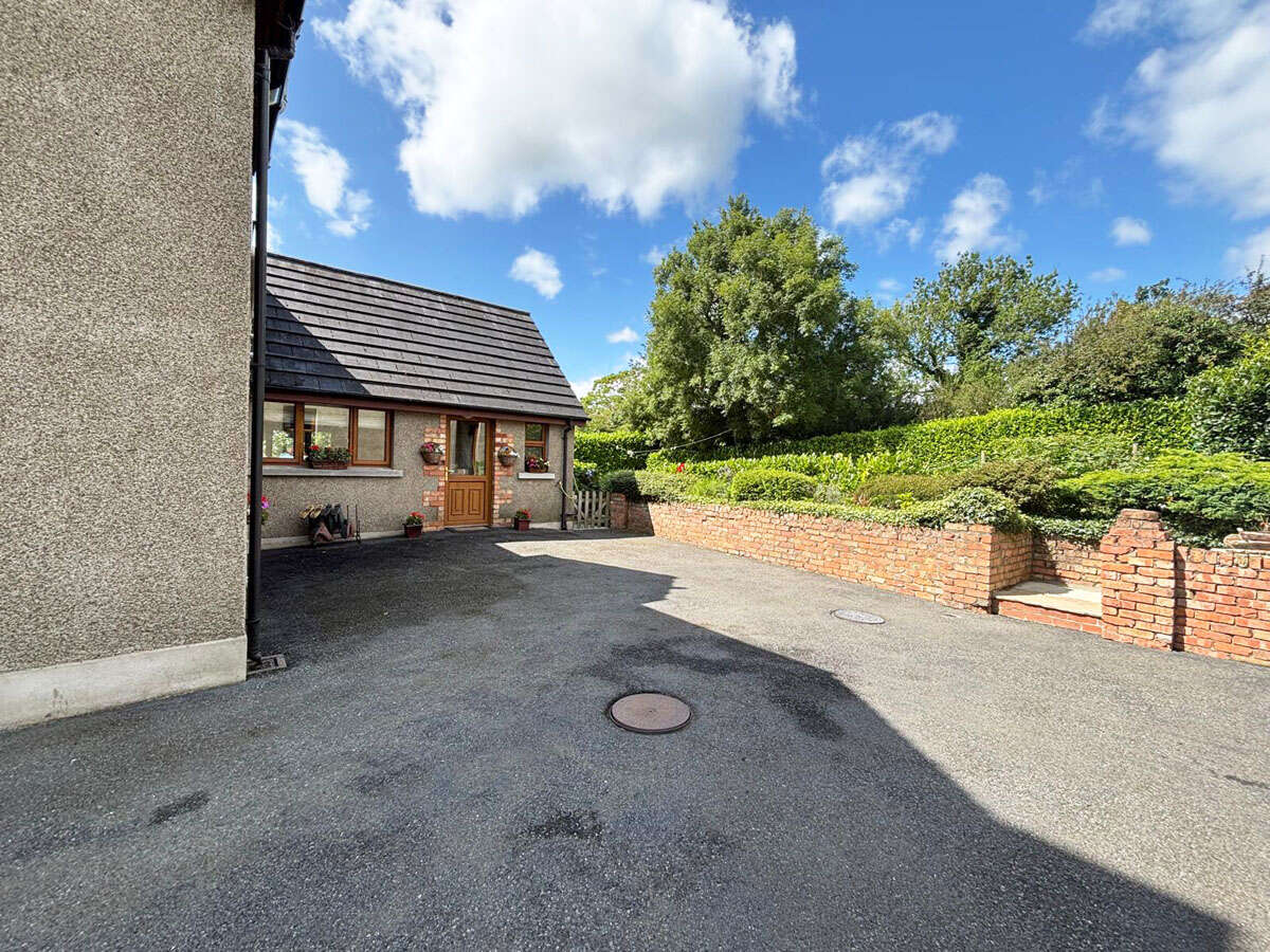 Double cast iron gates leads from Glaskerbeg Road onto tarmac driveway leading to front and side of property. Detached double garage with office/games room above. Stables and paddock.
