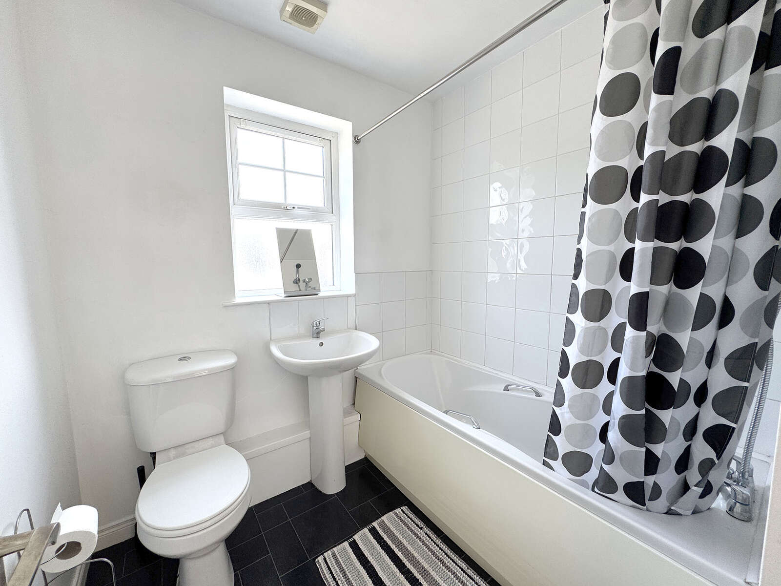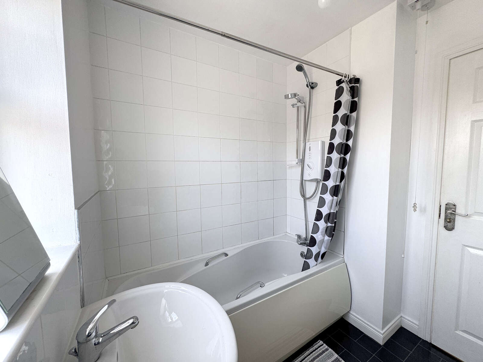 Bathroom: 6’7 x 6’6 (2.01m x 1.98m) White bath with electric overbath shower, WC, wash hand basin with mixer taps. Vinyl floor and part tiled walls.