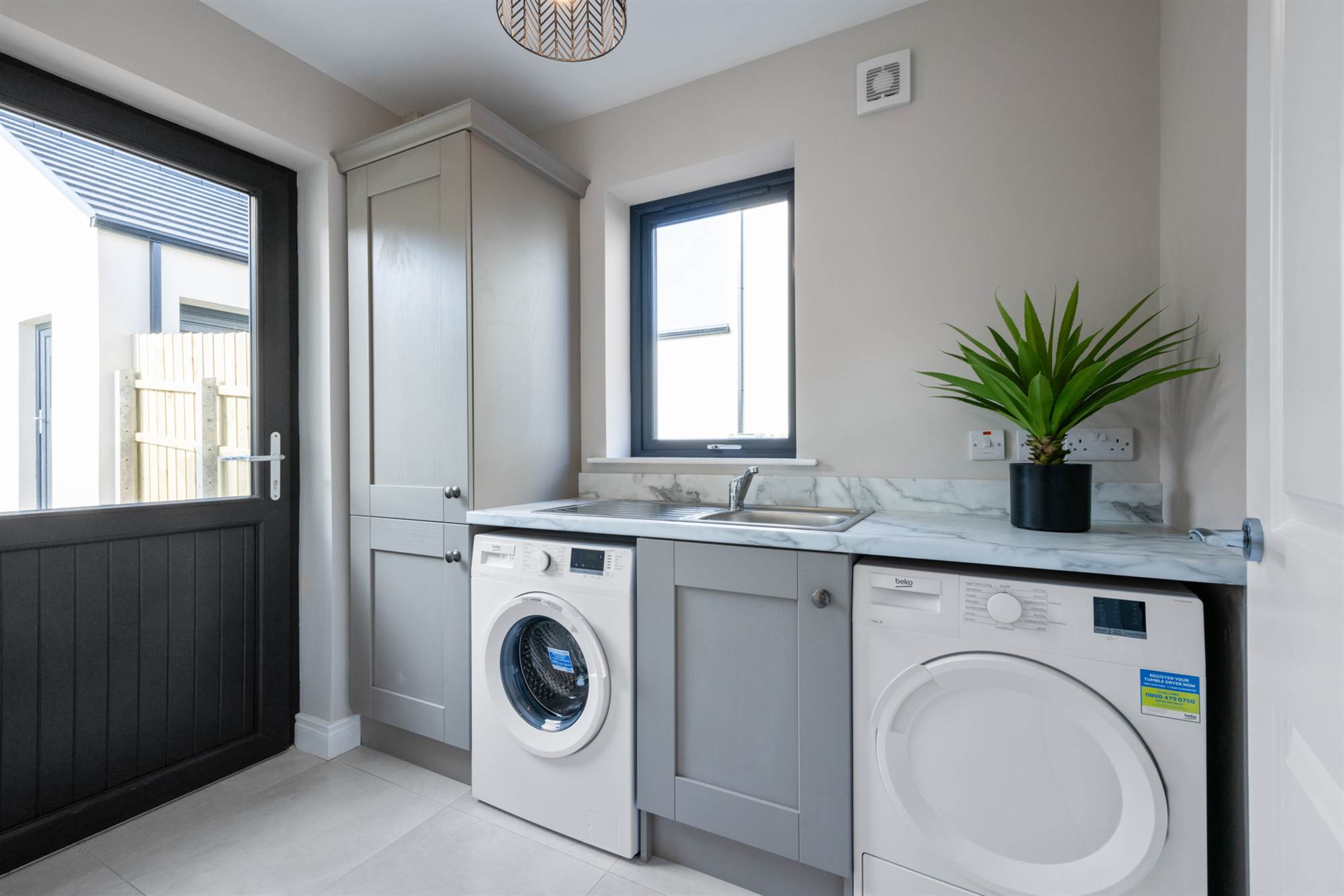 Integrated appliances including built-in oven, electric hob, extractor hood, dishwasher, fridge freezer and washer/dryer (free standing washing machine to utility where applicable)