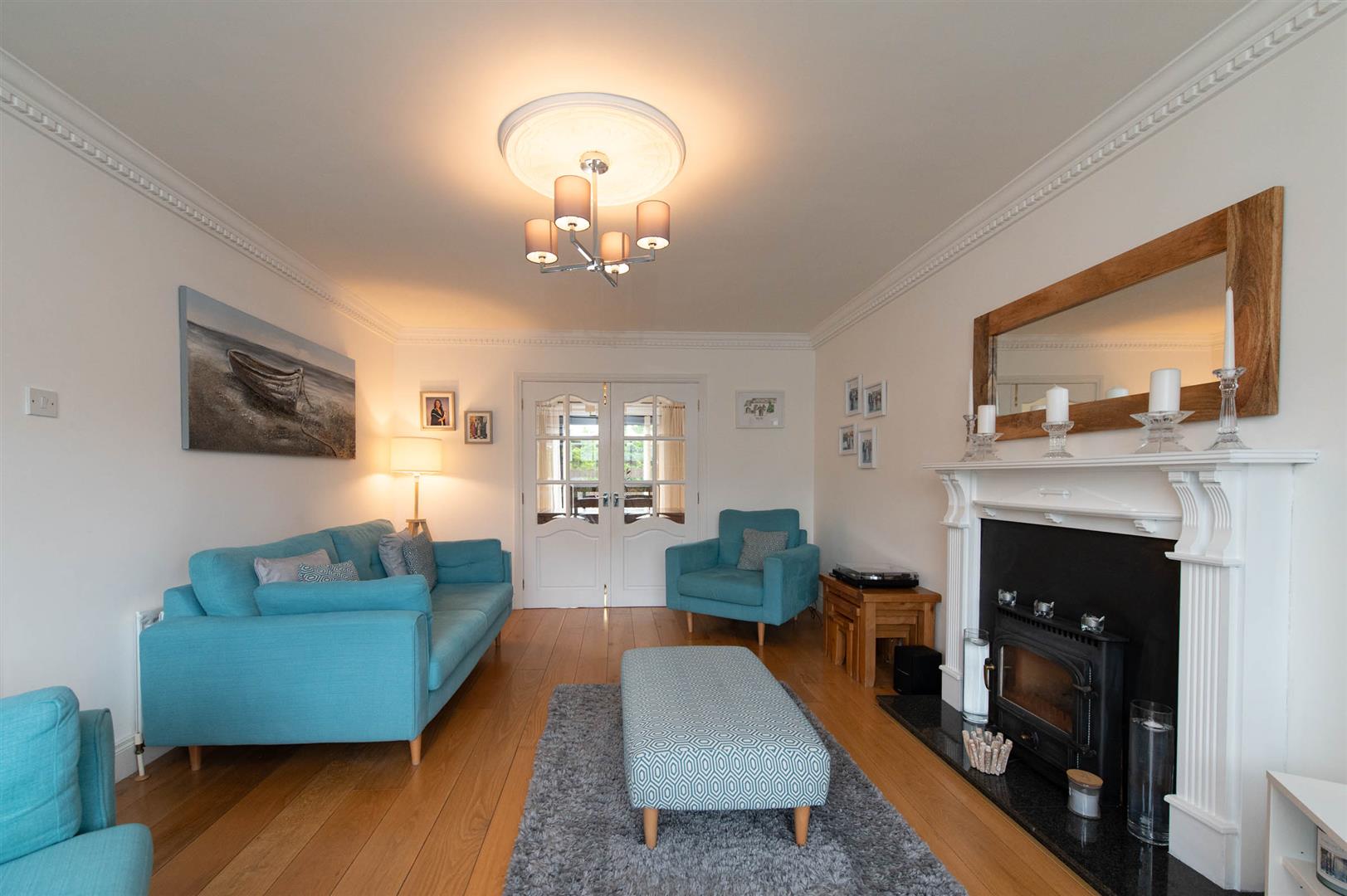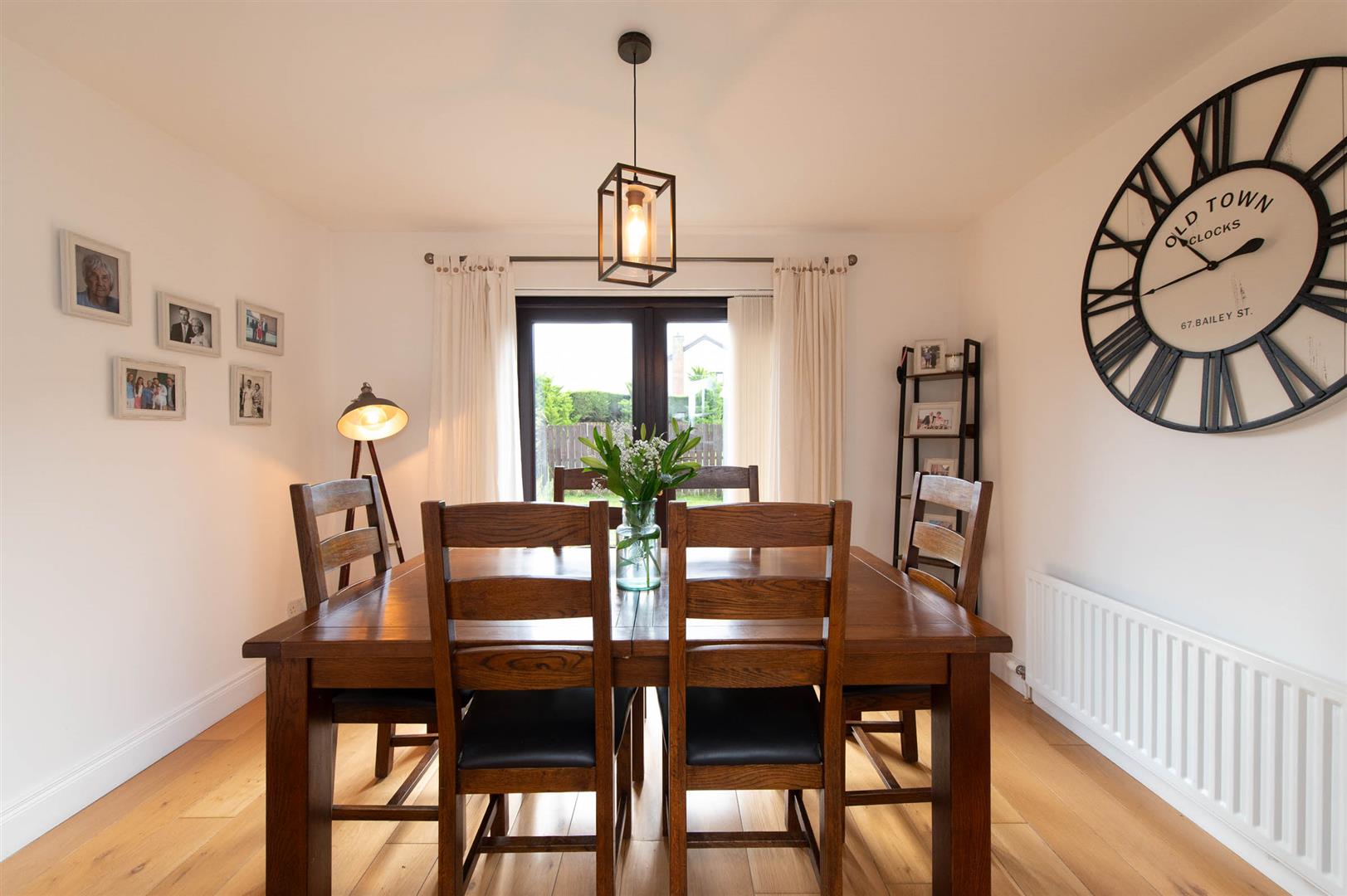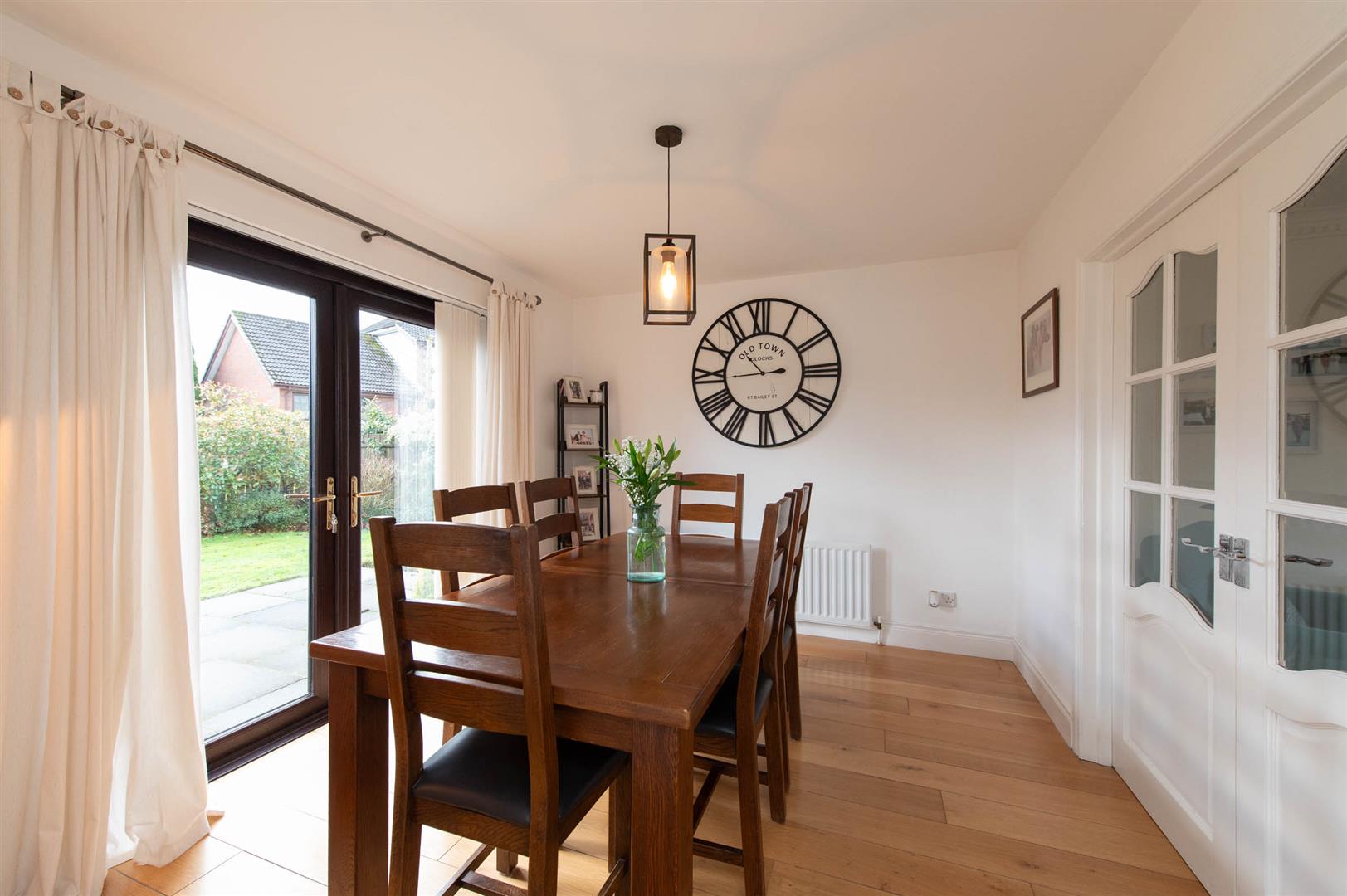 Tiled entrance hallway leading to spacious & freshly painted Lounge with hard wood flooring, stunning bay window and stove fitted, French doors leading into the bright and inviting Dining room, again with hard wood flooring and newly installed PVC French, double patio doors. Family room with freshly laid carpet & recently painted. Modern fitted Kitchen with tiled floor comprising integrated Dish Washer, Eye level Grill & Oven, integrated Hob & integrated Fridge Freezer with space for dining. Utility room with tiled flooring, high & low level units with space for washing machine & dryer. Access to the ground floor W.C with newly installed sanitary ware comprising W.C and wall hung hand basin. Access to the double integral garage and back door access.