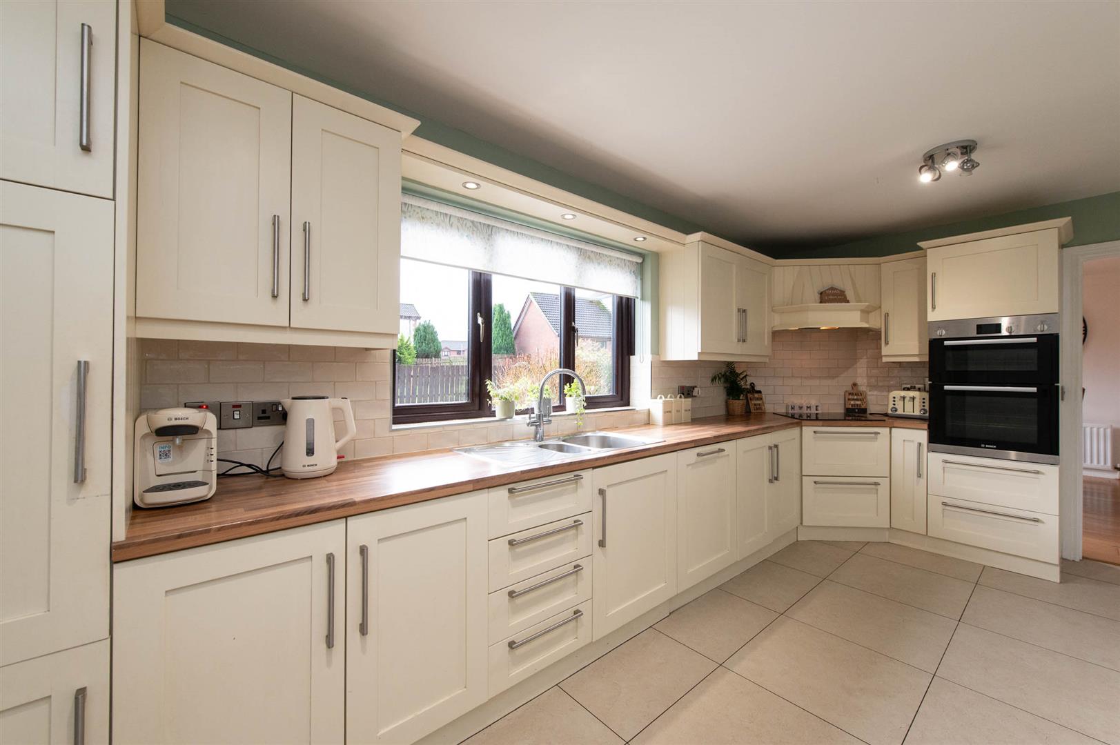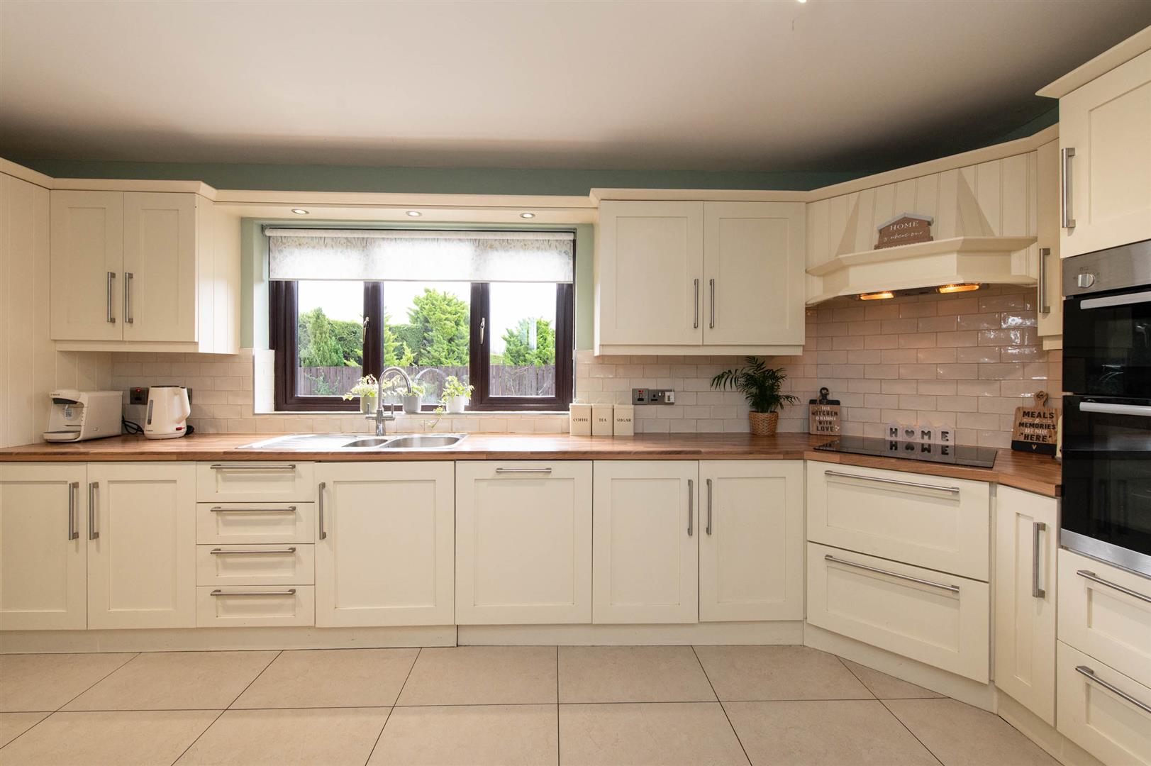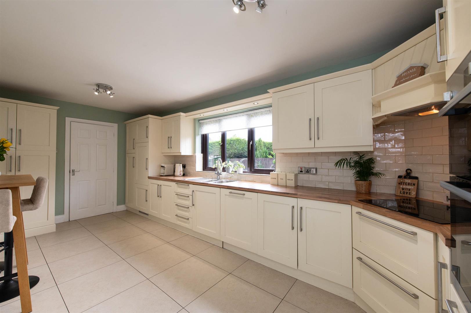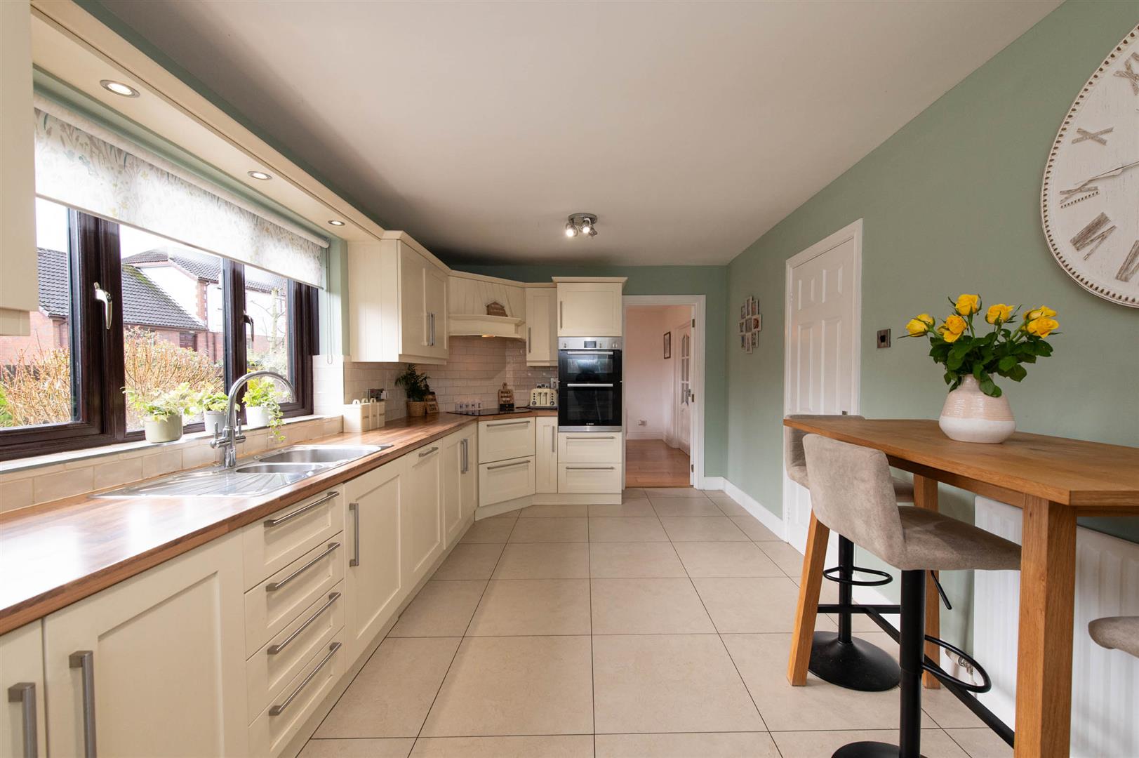 Tiled entrance hallway leading to spacious & freshly painted Lounge with hard wood flooring, stunning bay window and stove fitted, French doors leading into the bright and inviting Dining room, again with hard wood flooring and newly installed PVC French, double patio doors. Family room with freshly laid carpet & recently painted. Modern fitted Kitchen with tiled floor comprising integrated Dish Washer, Eye level Grill & Oven, integrated Hob & integrated Fridge Freezer with space for dining. Utility room with tiled flooring, high & low level units with space for washing machine & dryer. Access to the ground floor W.C with newly installed sanitary ware comprising W.C and wall hung hand basin. Access to the double integral garage and back door access.
