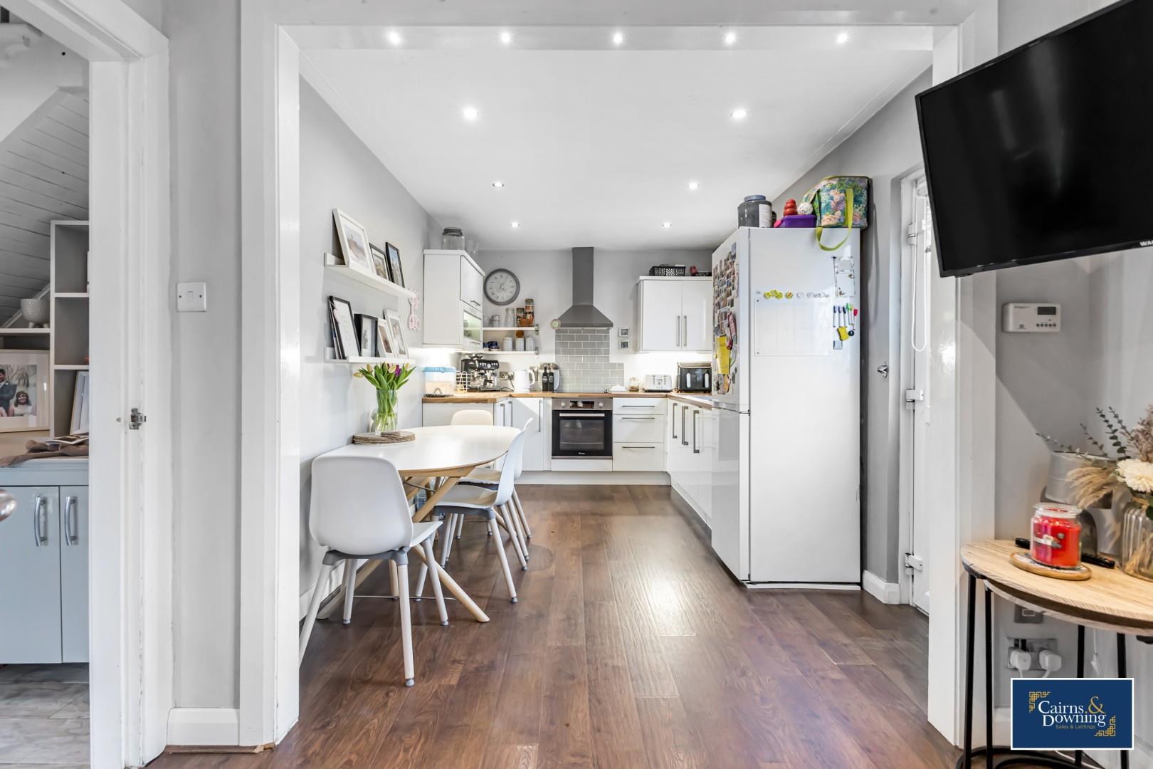 Window to rear, high and low level units, stained wood flooring