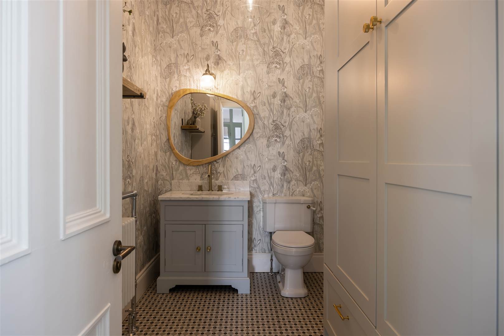Comprising low flush wc, Duravit inset sink with marble surround and splashback, gold swan neck taps, ceramic tiled floor, cornice ceiling. Period style radiator, built-in cabinets with hanging space and cupboards below.