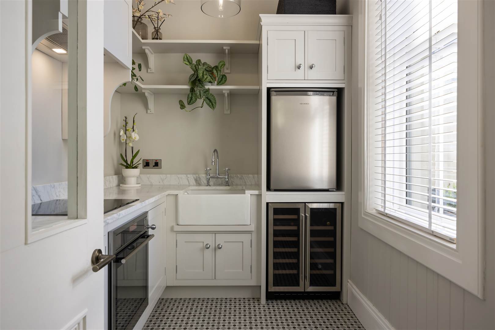 Hand painted shaker style doors with marble worktops and splashback, open shelving, inset Belfast sink with chrome mixers, integrated AEG oven and AEG induction hob, extractor canopy above, space for a wine fridge and fridge, ceramic tiled floor, cornice ceiling, feature tall wall mounted radiator.
