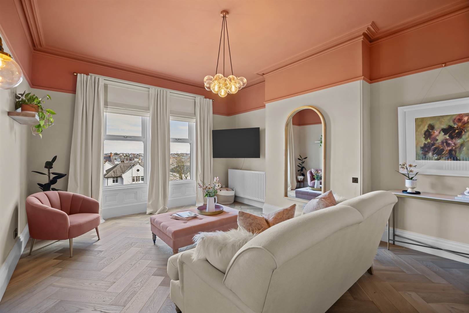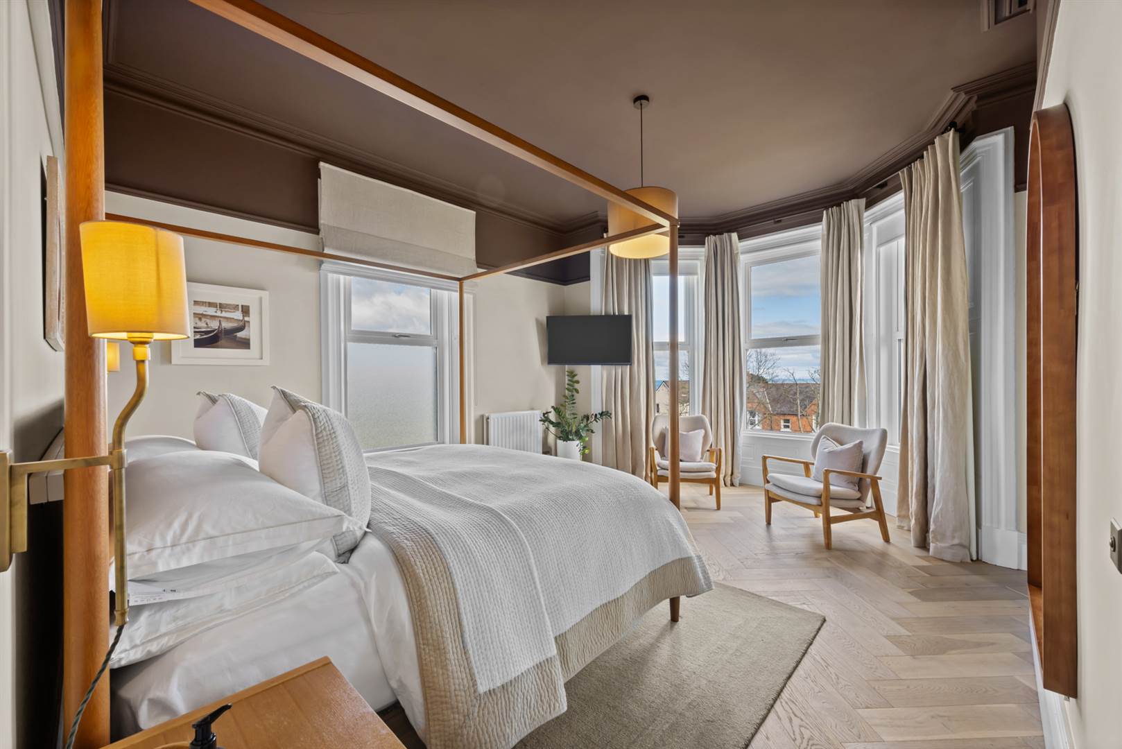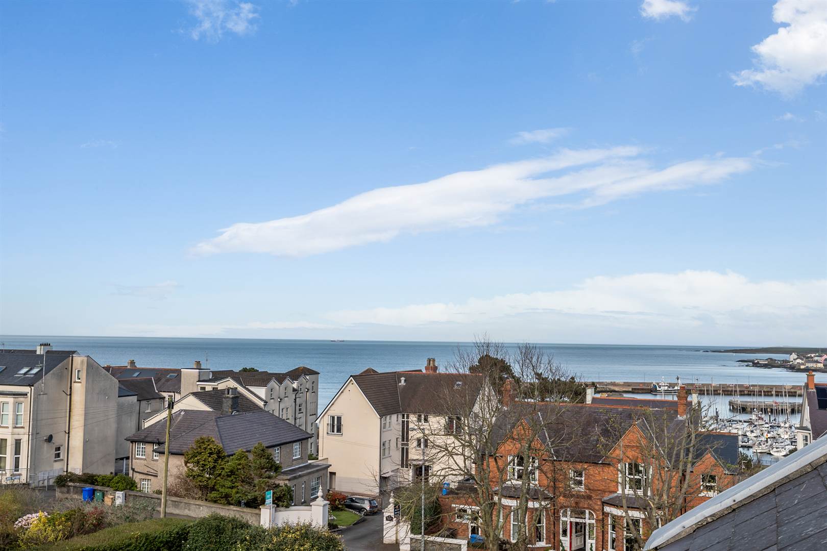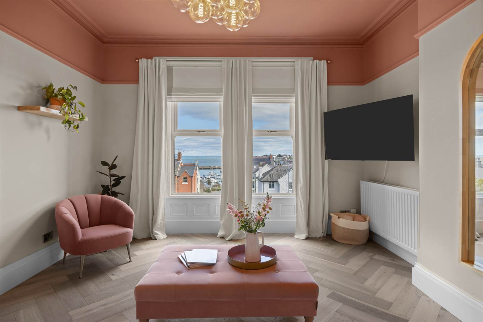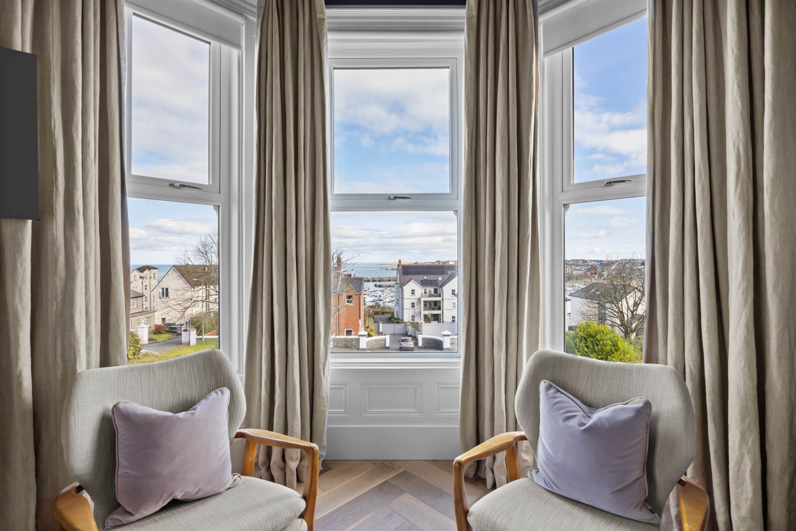 Limed oak herringbone floor, cornice ceiling, picture rail. Views over Bangor Marina, the Irish Sea and Scotland on a good day.