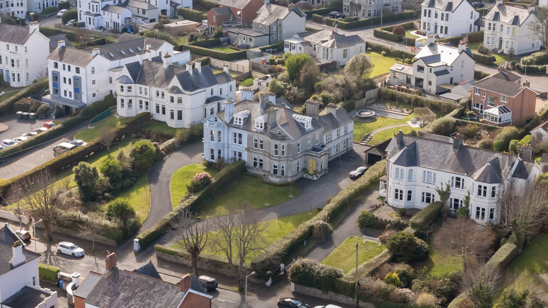 Impressive drawing room and dining room each with feature fireplaces, herringbone flooring and views to Bangor Marina and the Irish Sea