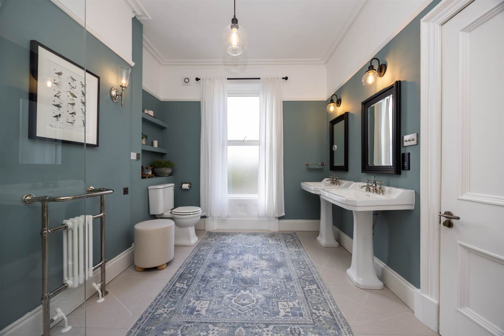 A wide walk-in shower, thermostatically controlled shower unit with telephone shower and over drencher, tiled shelf. Heritage claw and ball foot cast iron bath with wall mounted mixer tap and telephone shower. Burlington his and hers pedestal wash hand basins with mixer taps, two electrical shaving points, low flush wc, period style heated towel radiator, electric underfloor heating, porcelain tiled floor and part tiled walls, cornice ceiling picture rail, open shelving, wall lighting.