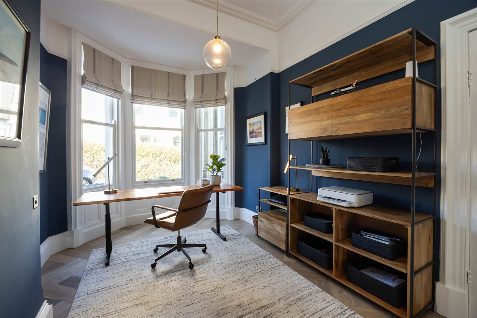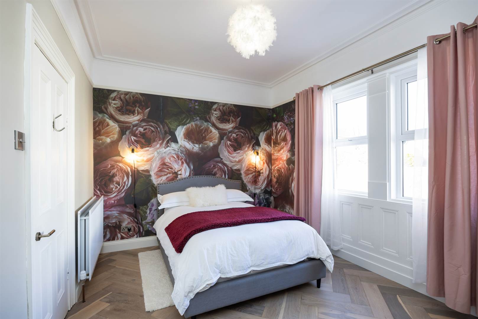 Limed oak herringbone floor, cornice ceiling, picture rail, built-in wardrobes.