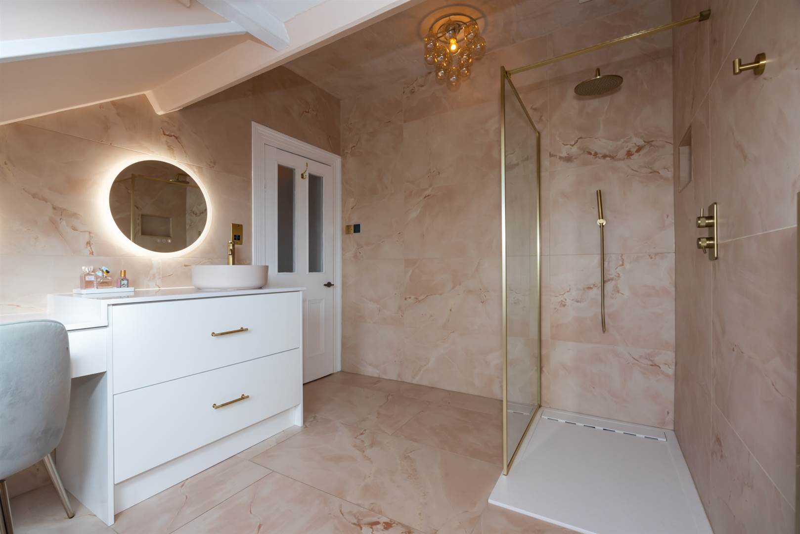 Fully tiled shower cubicle with slimline shower tray, gold thermostatically controlled shower unit with over drencher and telephone shower, gold heated tall radiator, low flush wc, contemporary rice bowl sink with mixer tap set on a stone worktop with cupboard below and vanity unit with drawers, ceramic tiled floor, fully tiled walls.