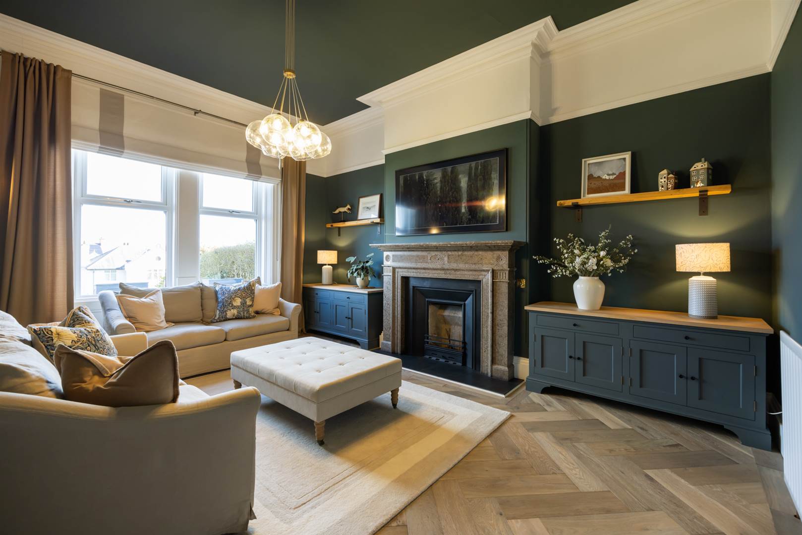 Limed oak herringbone floor, picture rail, cornice ceiling, feature panelled bay window, glazed door to entrance hall.